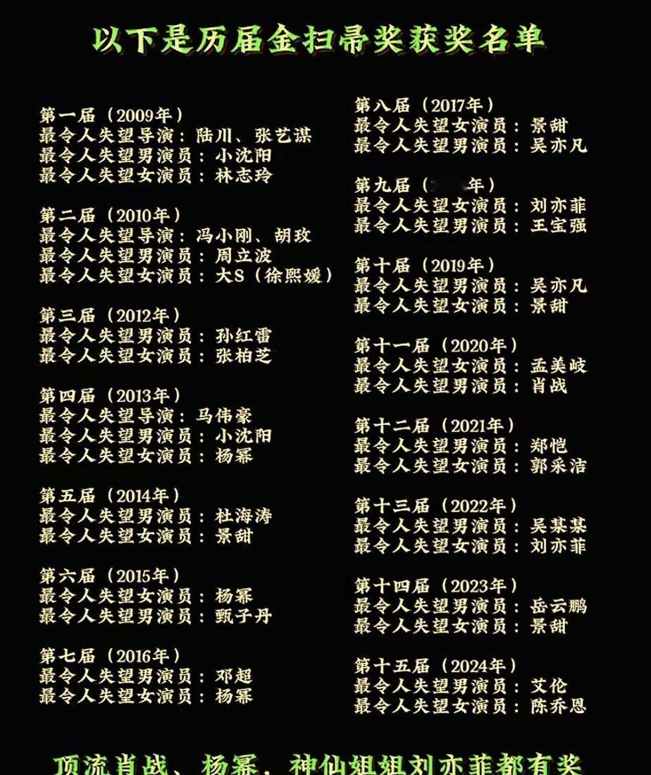 杨幂第三次拿金扫帚,不是演技差,是剧本和表演脱了节。 嘟嘴瞪眼撑不起人物,观众不买账,票房五千万,豆瓣4.4,不是观众狠,是片子没撑住。 王宝强当年领奖那句“好好做电影”,真把金扫帚从骂战变镜子。 现在不看粉丝数,只看票房和评分倒挂,三亿票房还低于5分才配上榜,流量再大也进不了门。 邓超《中国乒乓》豆瓣6.8,没进榜不是被放过,是规则卡得死——不是人情,是数据说话。 景甜没上榜? 她拍的是合拍片,压根不在评选范围。 别乱扣帽子。 刘亦菲2020年因《花木兰》被批配音断裂,后来拍《去有风的地方》,没人提了,因为那不是商业片,金扫帚不盯文艺片。 肖战转剧圈,自动离场,不是封杀,是赛道换了。 吴亦凡的名字被删了,不是黑历史抹不掉,是主办方说:作品和人,得分开。 违法的归法律,电影的归电影。 今年新设“进步奖”,孟美岐豆瓣从5.9冲到7.1,艾伦票房翻倍,直接“脱扫”。 杨幂要是下一部片子口碑涨1分、赚了钱,官方照样给你摘帽——这不是惩罚,是给台阶,也是给机会。