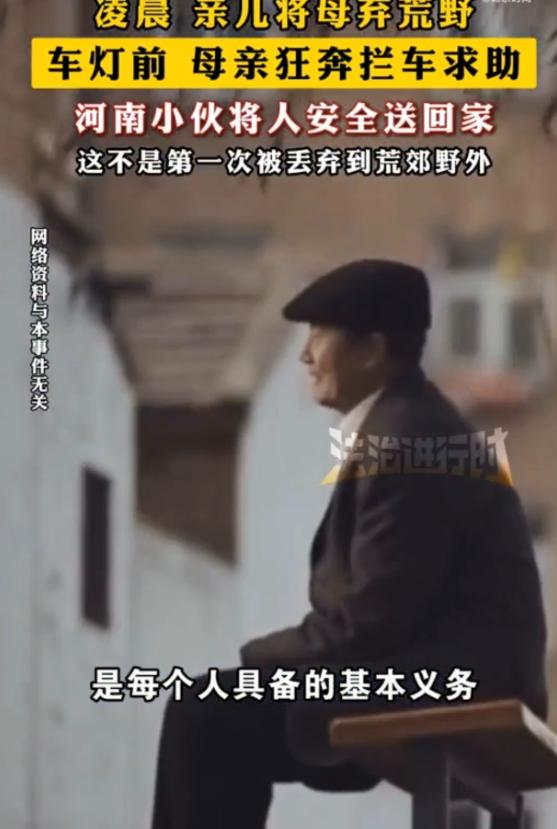 河南,一名老年女性在荒野中狂奔拦车求救,自称被亲生儿子遗弃。救助者将其送回家的路上,老人哭诉儿子“多次将她丢弃到荒郊野外”,且此次为深夜遗弃。 10月8号凌晨,河南的郊外一片漆黑,只有偶尔路过的车辆会用灯光短暂划破夜色。 就在这时,一位老母亲突然从路边冲了出来,疯了似的朝着一辆正在行驶的车奔去,双手紧紧扒住车窗,声音里满是哭腔还带着颤抖,一个劲儿地喊着“救救我!我儿又把我扔这儿了……” 开车的小伙叫张卫峰,是河南本地人。 他赶紧停下车,下车询问后才知道,老人已经不是第一次被亲生儿子丢在这种荒郊野外了。 之前儿子也是这样,白天装着要送她出门,结果车开着开着就拐到了没人的地方,扔下她一个人面对黑夜里的寒冷和恐惧。 张卫峰看着老人冻得瑟瑟发抖又无助的样子,心里不是滋味,没多犹豫就让老人上了车,一路把她安全送回了家。 路上,老人还是止不住地哭,跟张卫峰念叨着自己的委屈。 这些话被张卫峰记在了心里,后来他把遇到老人的经过记录下来,这段视频一传到网上,很快就引发了震动。 “亲生儿子多次将母亲遗弃荒野”的话题直接冲上了热搜,评论区里一下子就炸了锅。 有网友说“生他养他的娘,咋能像扔垃圾一样丢在野外?”还有人忍不住问“人心都是肉长的,他夜里能睡得安稳吗?” 大家在心疼老人、夸张卫峰做得对的同时,也开始猜测,到底是啥原因能让做儿子的这么狠心,一次次抛弃自己的母亲。 有人觉得可能是家里的矛盾积了太久,几十年的“旧疙瘩”没解开,到了养老这一步就彻底爆发了,儿子才会把赡养当成“算账”,不管老人的死活。 更多人觉得,说不定是经济压力太大,现在照顾老人可不像以前那样“给口饭吃”就行。 尤其是要是老人身体不好、需要专人照顾,每个月的护理费就得几千块,再加上吃药、看病的钱,家庭不好确实很难扛得住,可能就有人想通过这种极端的方式逃避。 像这样的“弃亲”事儿,之前也发生过。 2024年1月,大连正是零下20多度的寒冬,有个60多岁的老父亲,被儿子吕某某哄着说“去旅游”,结果车子开到内蒙古呼伦贝尔的莫日格勒河景区,儿子就留下一句“你自己待着”,然后开车走了。 老人穿得单薄,在极寒天气里冻了8天,双脚严重冻伤,差点就坏死了,后来景区工作人员发现他的时候,他都快说不出话了。 可儿子被抓住后,居然轻描淡写地说“不想管了”,跟这次河南遗弃母亲的事儿比起来,这位老父亲可没那么“幸运”,没遇到像张卫峰这样的好心人,遭了大罪。 不管是因为家庭矛盾还是经济压力,这些都不能成为遗弃父母的借口。 从法律上来说,《中华人民共和国刑法》第二百六十一条早就明确了,成年子女对年老、没有独立生活能力的父母有扶养义务,要是拒绝扶养还情节恶劣,就构成了遗弃罪,最高能判五年有期徒刑。 之前营山就有个男子因为遗弃患病的母亲被刑拘,长沙也有个男子长期不赡养父母,最后被判决丧失了继承权,这些例子都说明,法律对这种行为从来不会姑息。 从道德上讲,“鸦有反哺之义,羊有跪乳之恩”,父母辛辛苦苦把孩子养大,到老了却要面对被亲生子女抛弃的结局,这不仅丢了“百善孝为先”的传统美德,更是突破了做人的基本底线。 现在当地相关部门已经介入调查河南这起“荒野弃母”的事儿了,相信很快就会有结果。 说到底,赡养父母从来不是可做可不做的选择题,而是每个成年人必须尽到的责任,不管是法律还是道德,都容不得半点逃避。