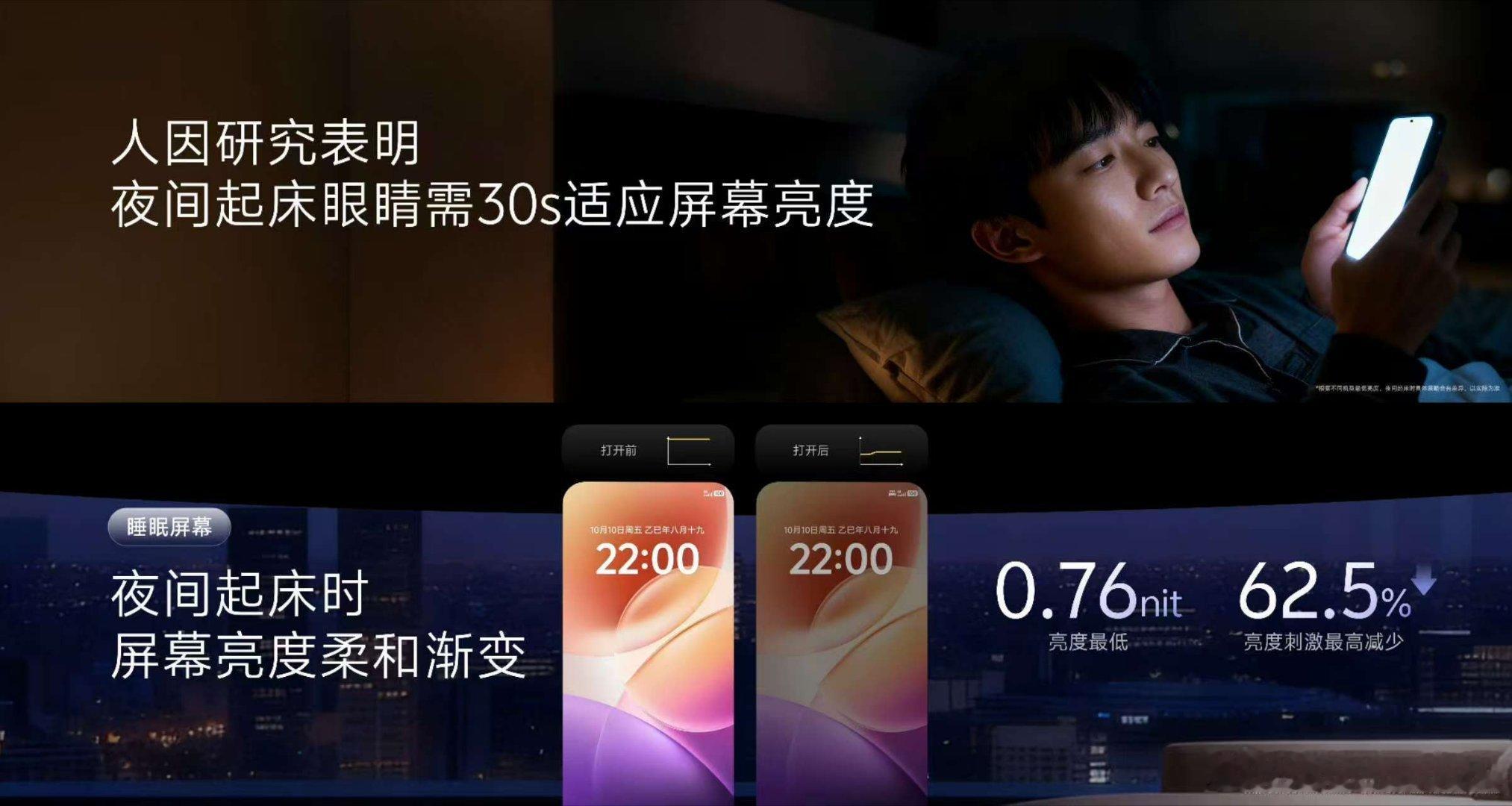 vivo通过人因研究发现,夜间唤醒屏幕时,人眼需要30秒,才能从黑暗中逐渐适应光亮。因此vivo带来全新「睡眠屏幕」功能。当你夜间起床看手机时,屏幕像月光一样温柔地点亮,不会惊扰你的朦胧睡意。屏幕亮度变化,是符合视网膜舒适亮度模型的,亮度最低到0.76nit,亮度刺激最高可以减少62%。