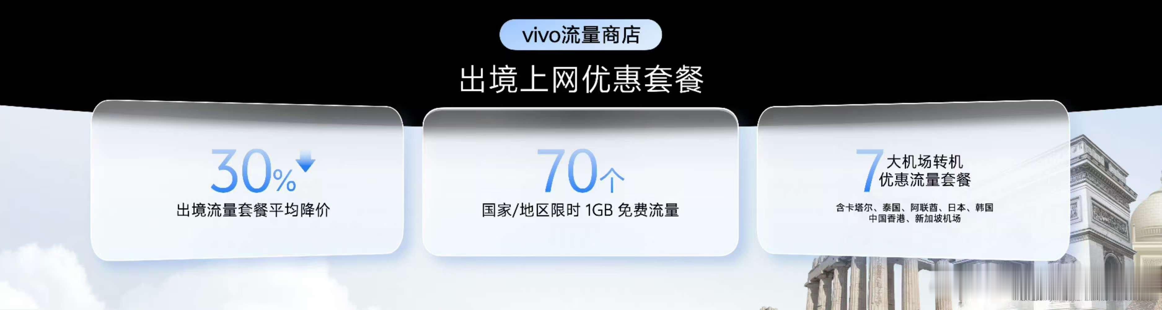 vivo一直为用户提供出境流量服务。今年,vivo加大自费补贴力度,把价格平均降低了30%,并将 1GB 免费流量覆盖范围拓展至 70 个国家和地区,同时上线 7 大机场转机优惠套餐,让出行不仅更划算,也更好用。