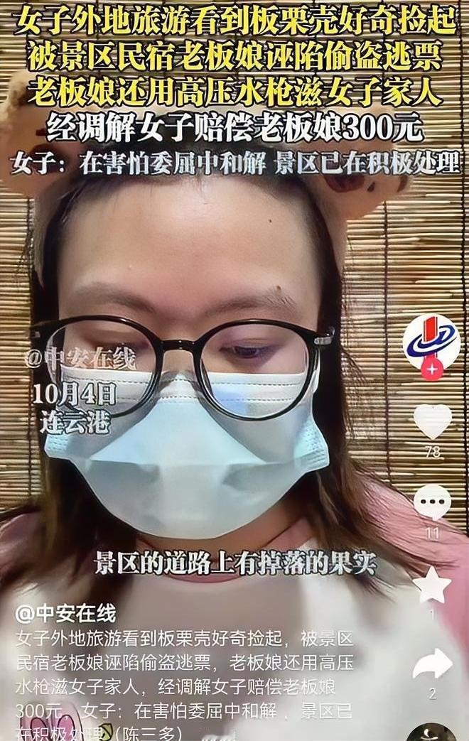 连云港文旅努力的宣传白费了! 连云港官方媒体宣传“在花果山七十二洞附近随手就能捡到圆滚滚的板栗。”,如今捡一个板栗就要300,谁还敢去。 国庆节期间,有游客在连云港花果山景区捡拾路边掉落的板栗壳,竟遭民宿老板污蔑为“小偷”,更是被高压水枪喷射、推搡辱骂。争执间游客轻微触碰对方,老板便顺势躺地,自称孕妇并索要2000元赔偿。其家人不施援手,反而继续争吵拍照,直至民警调解后,游客仍被迫支付300元“营养费”,却未见任何检查报告。 300元一颗板栗壳,实属荒唐。此事不仅反映出个别商户借题发挥、恶意讹诈的行为,更是暴露出景区对民宿管理缺位。当前正值旅游旺季,连云港文旅部门应该加强监管,杜绝类似“天价板栗”闹剧重演,不要让个别行为玷污了城市旅游形象。 出游花果山