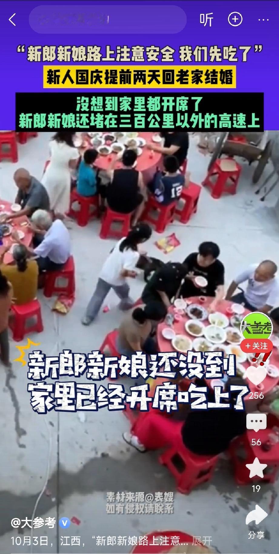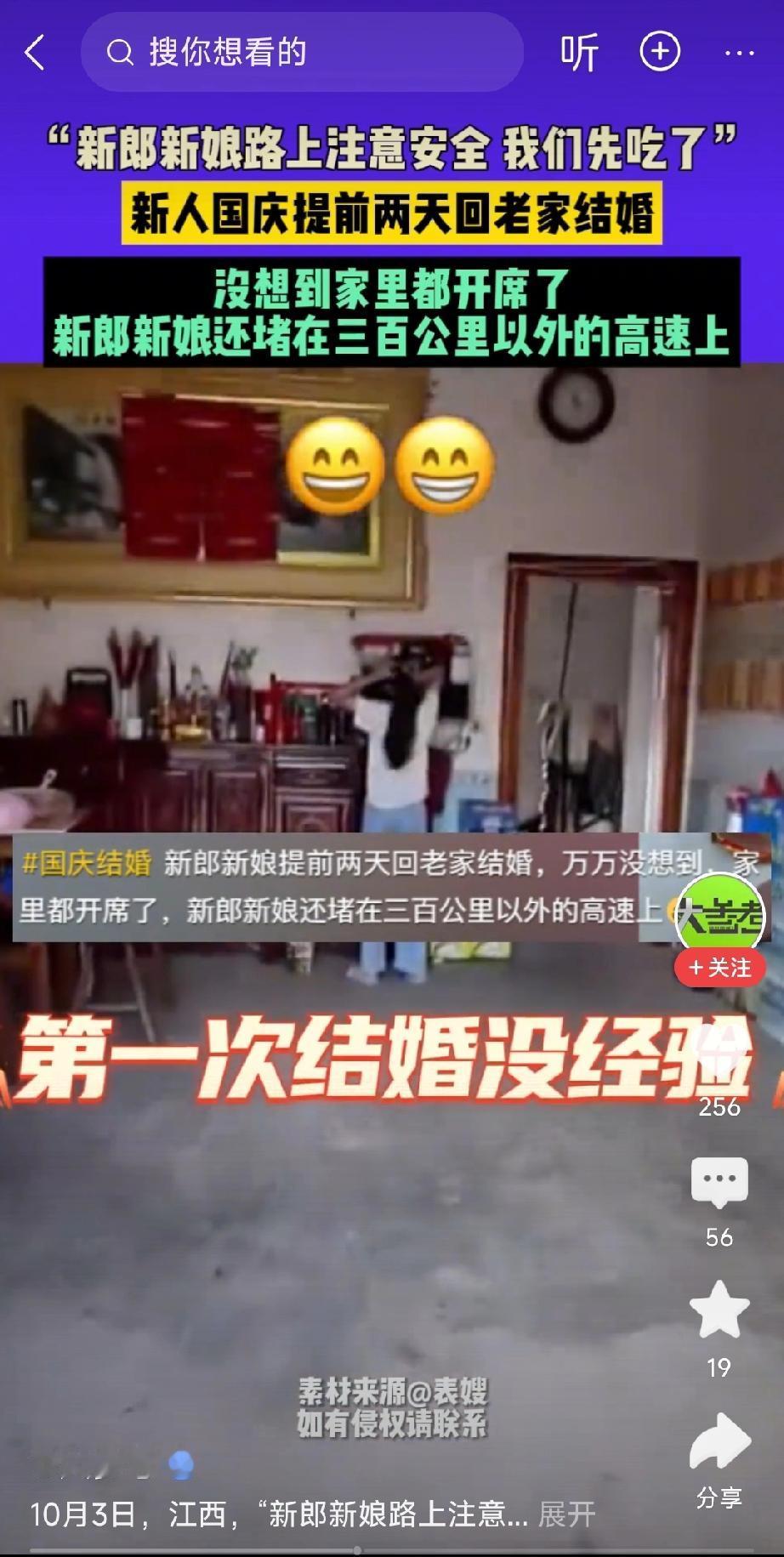 这恐怕是今年最难忘的婚礼。 江西一对新人, 第一次结婚, 新郎新娘没有经验, 国庆提前两天回老家结婚, 万万没想到, 家里都开席了, 新郎新娘还堵在三百公里的高速上。 网友评论:“没事,下次结婚就有经验了。”[捂脸] 婚礼尴尬的一幕 新郎新娘还堵在高速 家里先开席了