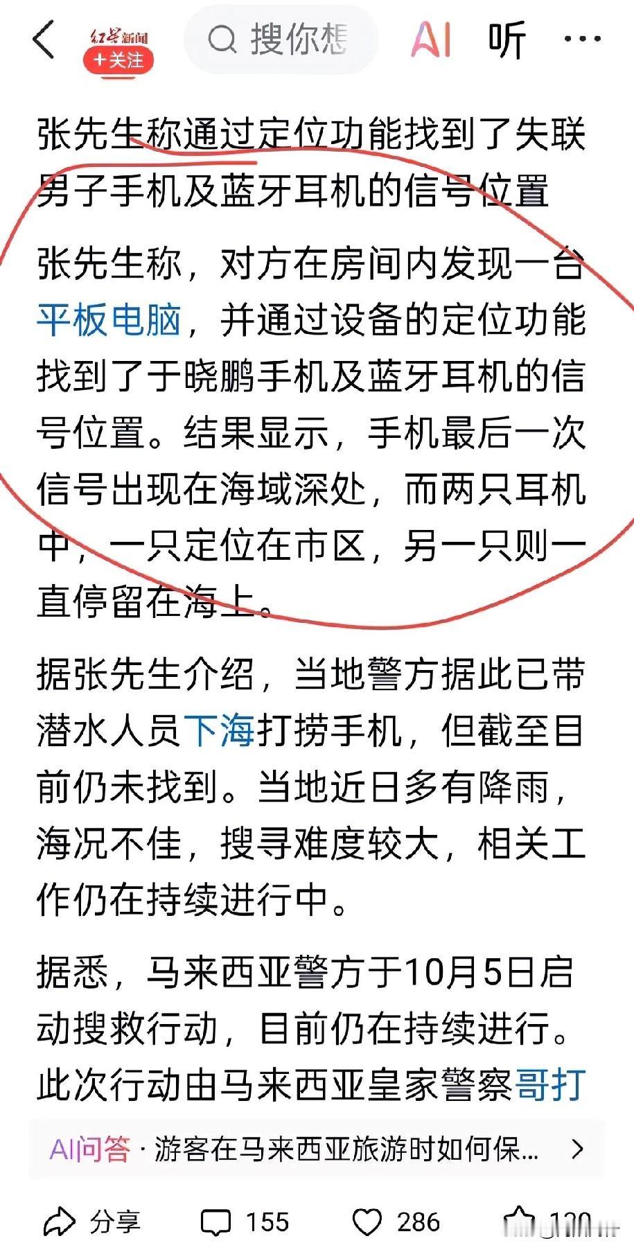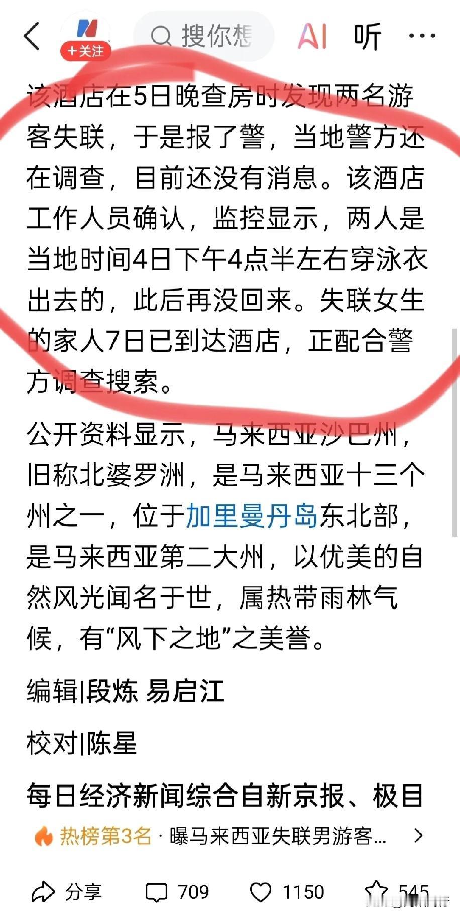 2名中国游客在马来西亚失联已超3天! 目前已知几个细节: 1、10月4日下午,这对年轻男女入住美人鱼岛度假村后,穿着泳衣外出看日落,自此音讯全无。失联前女孩还向家人发送海滩照片报平安。 2、通过电子设备定位发现,男子手机最后信号出现在遥远的海域,他的两只蓝牙耳机分别定位在市区和海上,情况令人担忧。 目前当地警方已展开大规模搜救,家属也紧急赶往现场。盼望能早日传来好消息。[祈祷][祈祷][祈祷]