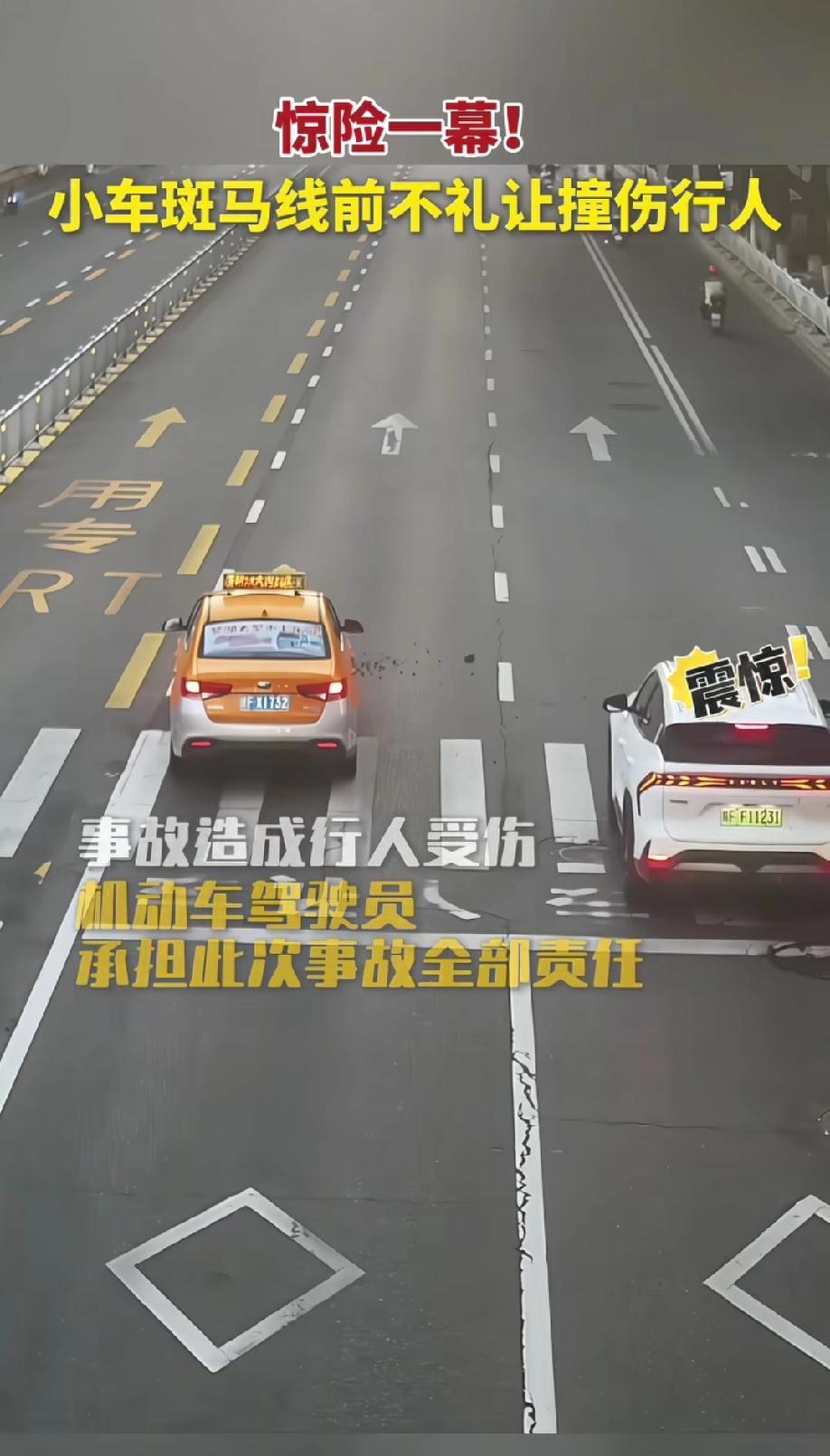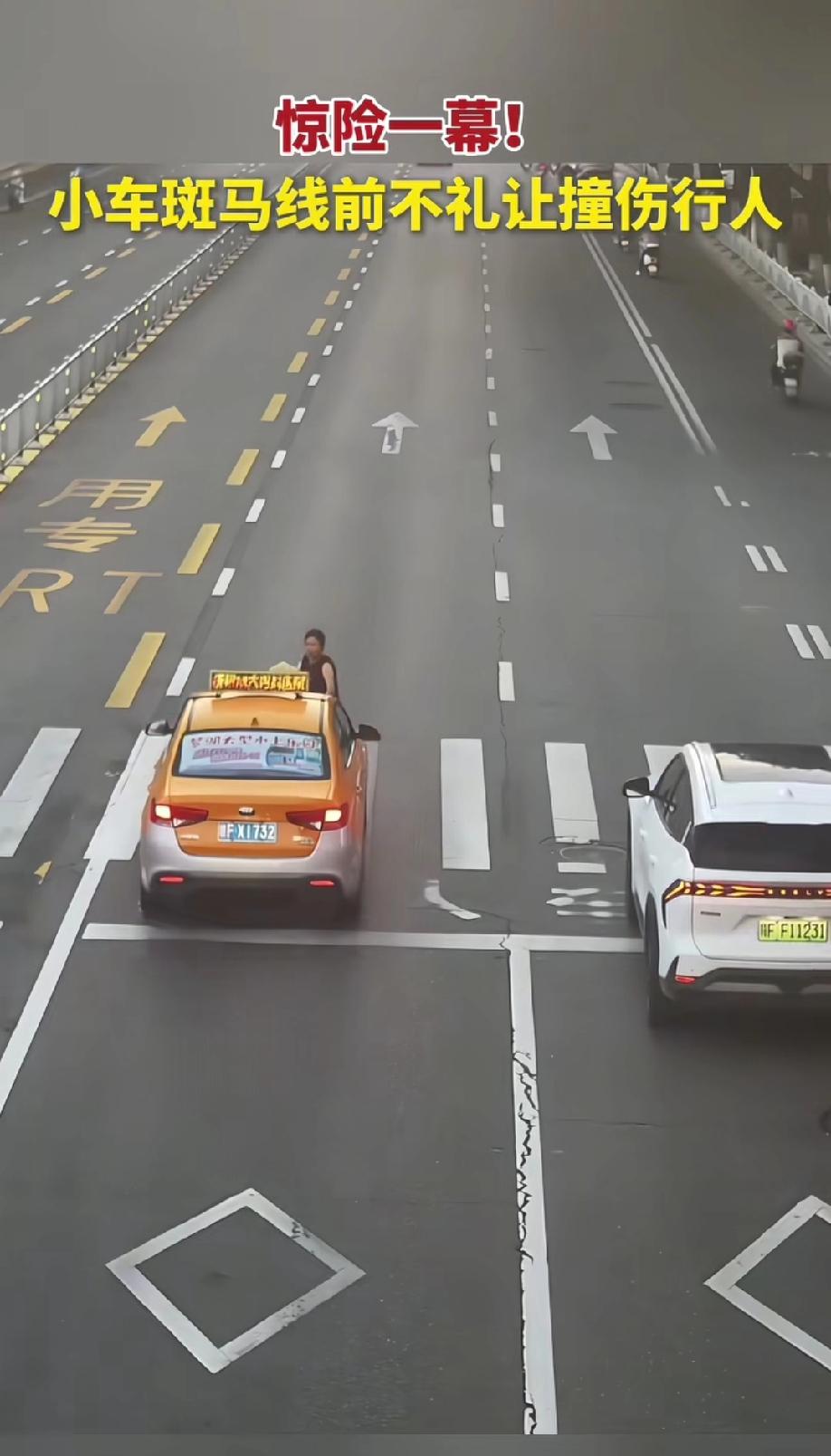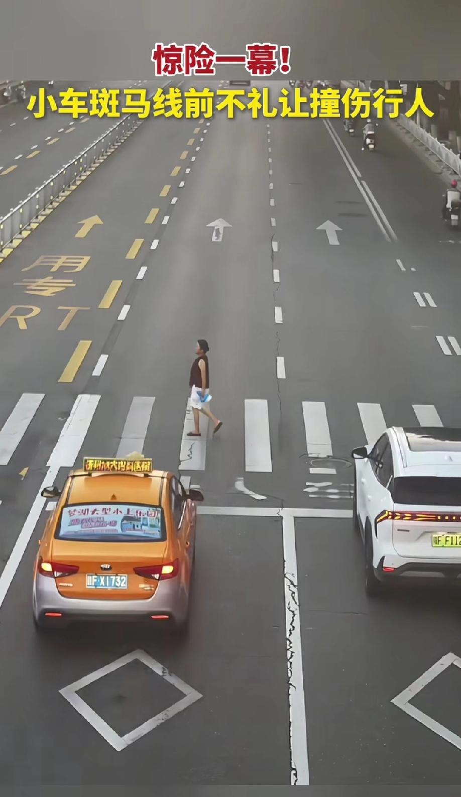 马路不是你家,出来害人就不对了, 一女子在斑马线闲庭信步,导致一出租车未及时刹停,将该女子撞伤,出租车因“未礼让行人”负此次事故的全部责任! 网友评论: 礼让惯的她像自己家客厅似的逛! 快走两步就是对礼让司机最大的尊重。 有的人就是,人家越礼让,她们越放慢速度。 经常碰到这种女的,本来就在闪黄灯了,还头昂起感觉很自信,慢慢开始走斑马线。 我很多年前开车有过这种情况,但是我反应及时刹住车了!吓得那位女士不敢过马路啦。 今天路过一个路口 ,一个老头还知道跑两步嘞。 你说人开车开的好好的,突然冒出个人刹车也刹不住。 我从来不敢这样过马路,法律还是太仁慈了,一看这女的就是那种横惯了的人。 人家根本不会看车,就慢悠悠的走,斑马线这样走的人太多太多了。 虽然我不是开车的,但是我最讨厌这种人,别人给你礼让了你只要不是残疾人就赶紧跑过去,慢悠悠的感觉别人欠你似的。 马路上不要大意