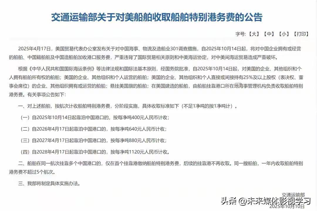 美国先对中国船舶收费,中方立马对等还击!从10月14日起,美国船停靠中国港口,按吨收费:起步每吨400元,逐年阶梯上涨,到2028年高达1120元!同一艘船一年最多收5次。 为啥这么狠?美国造船业快没了,想通过收费逼中国让步。但中国造船全球第一,占61%新订单,根本不吃这套!中方明确:绝不让步,维护公平海运! 大家觉得这波反制解气吗?支持中国还是美国?评论区聊聊!