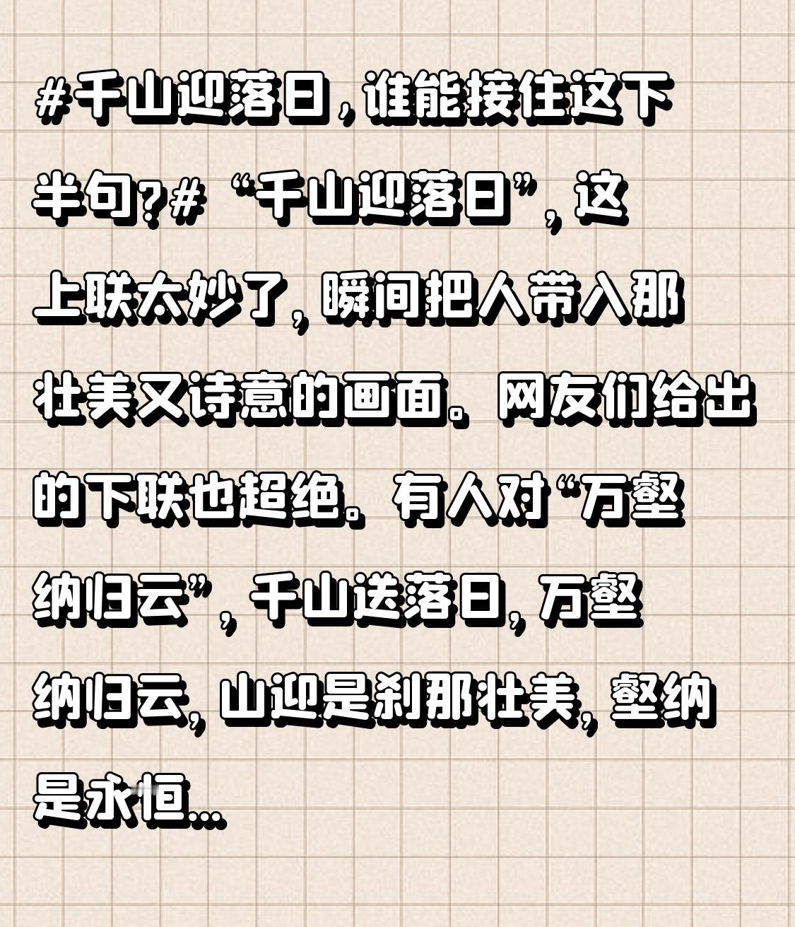 千山迎落日,谁能接住这下半句? “千山迎落日”,这上联太妙了,瞬间把人带入那壮美又诗意的画面。网友们给出的下联也超绝。有人对“万壑纳归云”,千山送落日,万壑纳归云,山迎是刹那壮美,壑纳是永恒慈悲,云有了归宿,意境禅意满满,像王维诗里的感觉。还有“万水送归舟”也不错,千山落日,万水归舟,白昼将息,画面感十足。我觉得对下联就像一场头脑风暴,既要对仗工整,又得有独特意境,大家的才华真是让人惊叹!