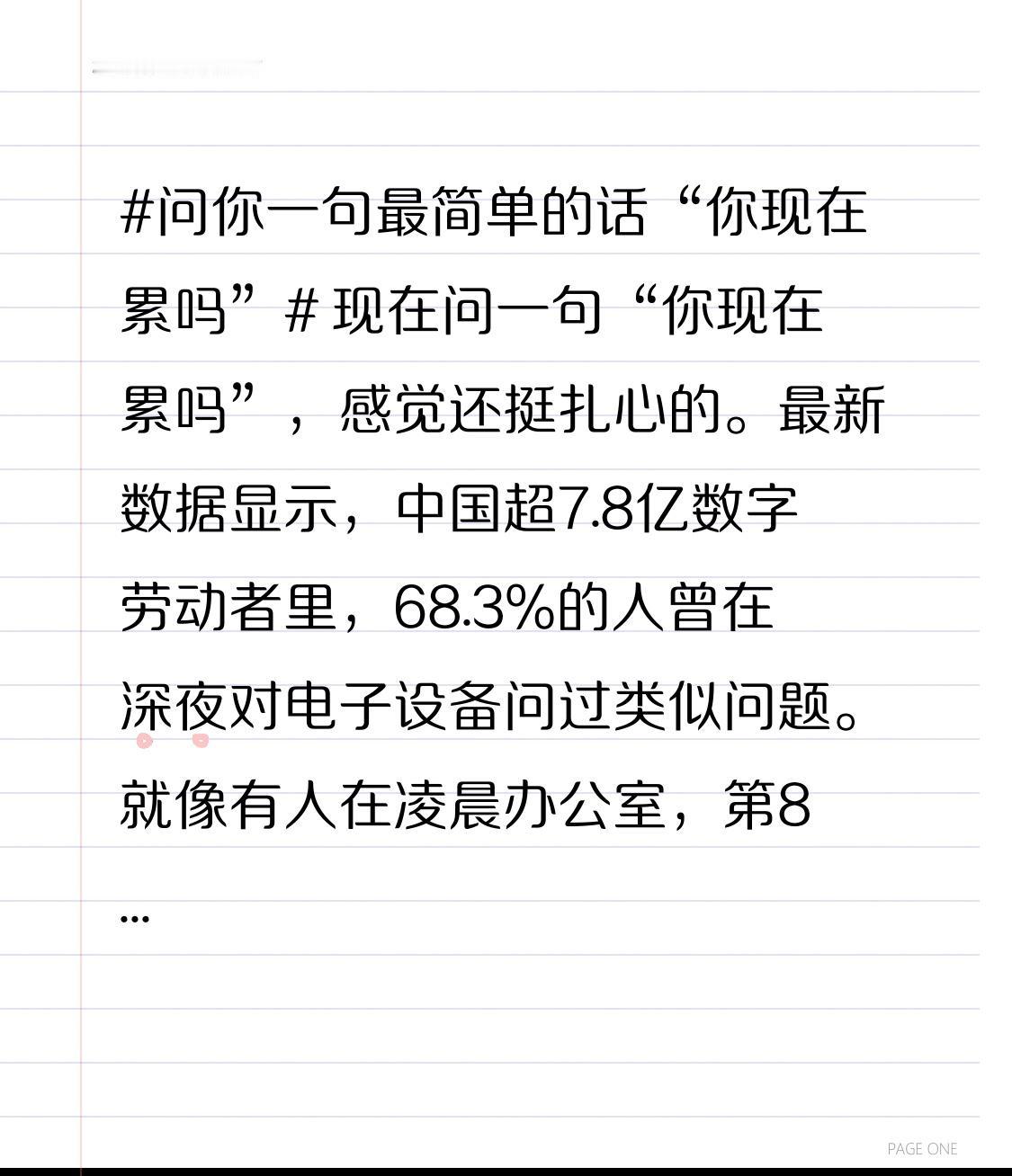 现在问一句“你现在累吗”,感觉还挺扎心的。最新数据显示,中国超7.8亿数字劳动者里,68.3%的人曾在深夜对电子设备问过类似问题。就像有人在凌晨办公室,第8次端起咖啡,对着手机下意识问“你现在累吗”。其实大家心里都明白机器不会累,却希望它能说“该歇歇了”。 我们习惯向机器要情感回应,怕打扰真实的人。AI永远不会说累,可它却在倒逼人类活成不知疲倦的机器。想想凌晨2点还秒回的智能客服,24小时不停的云计算中心,这生活,能不累嘛!