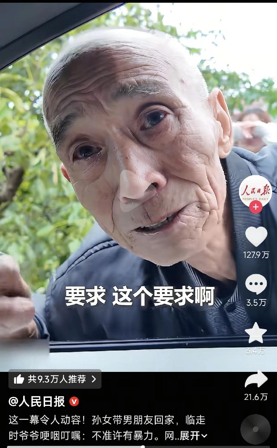 人民日报转发了一爷爷对孙女和她男朋友 离别时候的嘱咐!爷爷这下可以放心了,不单单他记住了,现在就连全国的网友们也都记住了! 一孙女带男朋友回家看爷爷,临走前爷爷在车窗前嘱咐起来,不能有暴力,不能打他孙女,就这一个要求。这一幕却看哭了众多网友! 有网友说“这怎么这么像我的爷爷在嘱咐我” 还有网友说“爷爷的强烈要求让我泪目了” 更有网友说“爷爷一定是思考了好久,酝酿了好久,该不该说?该怎么说?要当面呵护孙女,又要维护孙女婿的面子,临走了,终于鼓起了勇气。” 从爷爷的嘱咐中,看得出来有多么得心疼孙女,还有很多不舍,真的是从小捧在手心上的那种感觉,有这样慈祥的爷爷,这孙女真的太幸福了!