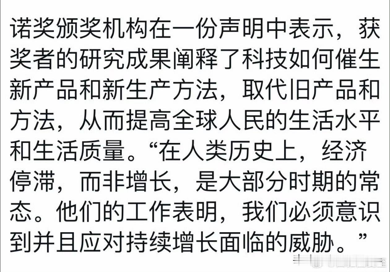 诺贝尔经济学奖委员会在一份声明中表示:“获奖者的研究成果阐释科技如何催生新产品和新生产方法,取代旧产品和生产方法从而提高全球人民的生活质量。经济学奖获奖者的研究显示,持续增长并非理所当然,人类历史上,经济停滞、没有增长,是大部分时期的常态,我们必须意识到这一点” 这是一个非常深刻且重要的观点,它颠覆了我们许多人对经济发展的固有认知。可以看作是一剂 “历史清醒剂” 。 我们正生活在一个人类历史上极其特殊和短暂的“增长时代”。这个时代并非由命运赐予,而是由一系列特定的技术、制度和全球化条件所催生。如果我们忽视这些条件,或者任由它们被侵蚀,那么历史常态——即经济停滞——就有可能回归。