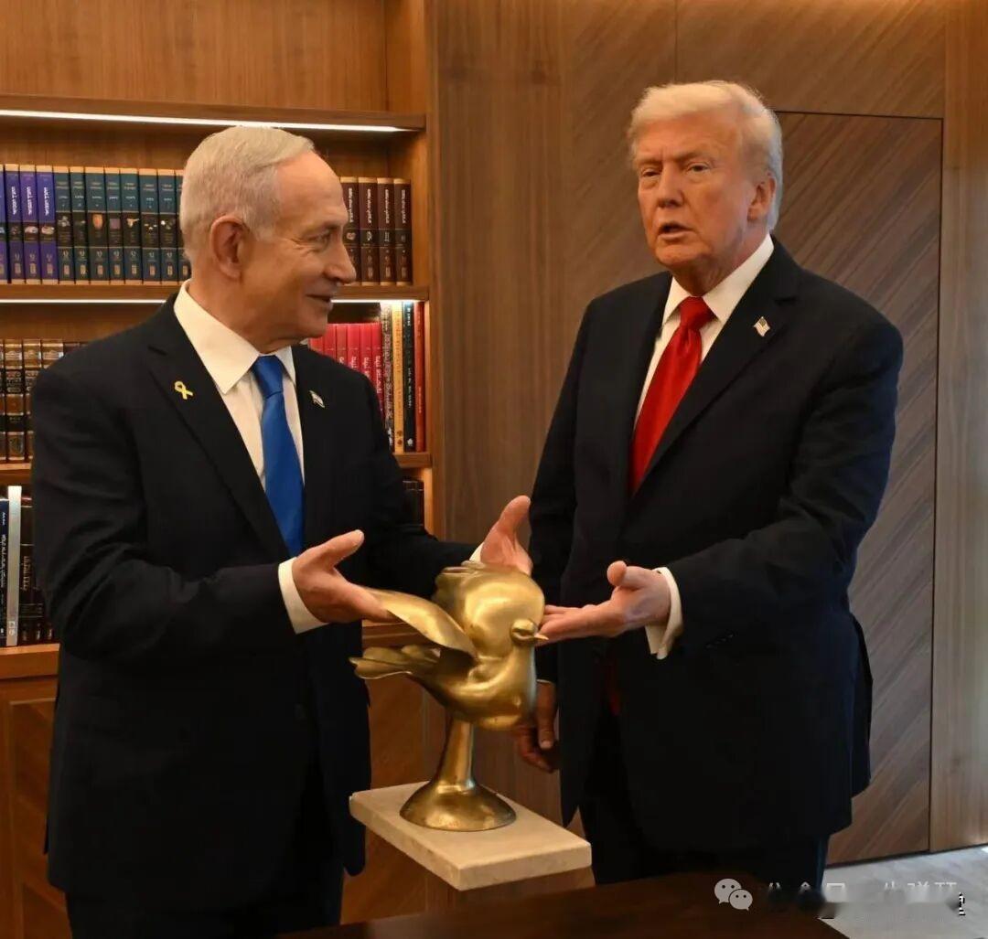 内塔尼亚胡:要放特朗普鸽子了 正在以色列监督巴以和平协议签字的特朗普总统获得内塔尼亚胡赠送的金鸽子。 有道是:金鸽子,银鸽子,攥在手里别大意。如果鸽子飞跑了,金的银的无意义。(观点不同不出恶声)