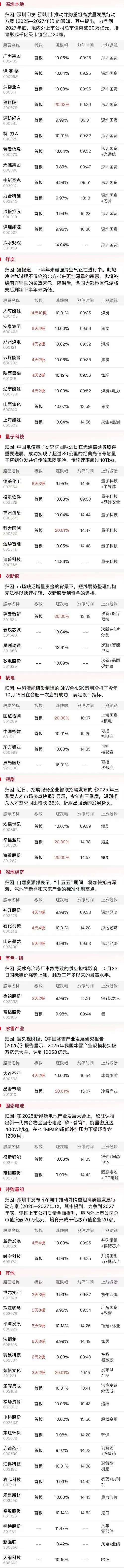 10月24日盘前预案:极限反转,沪指走出突破已毫无悬念,短线方向量子科技会是今天最大的看点! 1、昨天的市场走出了极致的逆转走势,午后仅用了1个小时,市场就迎来了全面的修复,三大指数全线翻红,结合消息面来看,十五五规划一些利好消息面和中美方面的经济会晤是导致反转的原因所在,但是我们可以看到,虽然市场整体情绪向好,但是量能是继续缩量的,全市成交额只有1.6万亿的情况下,市场很难全面爆发,缩量上涨是很难出现普涨行情的,所以短线市场分化依然非常严重,只有踏对了方向,才能与指数共振前行! 外围美股集体收涨,中概股走出了明显反转,A50震荡向上,外围整体环境不错,那么A股出现高开基本上没什么问题,但是从外围的上涨幅度看,A股今天想要出现大涨的概率并不大,能不能维持住小幅趋势冲高站稳3937会是今天最大的看点,毕竟指数一旦突破后能够稳住,短时间趋势上行的概率就非常大! 2、毫无疑问盘后市场发酵的最强题材就是量子科技,党的四中全会胜利闭幕,尾盘量子科技方向出现了超强抢筹形态,板块直线拉升,多只强势个股走出了直线拉板的走势,从盘后发酵的情况看,这个方向毫无疑问会是今天短线资金进攻的主战场,如果前排个股走出了非常强势的抢筹形态,那么整个板块或许会有明显的持续性,那么早信吃肉的概率还是非常大的,至少前排个股坑人的概率并不大! 格尔是先于整个板块启动的个股,它在早盘就强势封住了涨停,而且是明显的倍量突破走势,这样的表现加上题材的刺激,走出大单一字板的概率是非常大的,而它一旦给不到买点,这就说明整个量子科技很可能走出持续性,那么昨天比较前排的个股自然会受到资金的青睐,就像神开和石化二板开出一字后,整个深地经济方向是有明显跟随表现的,所以板块前排的表现会是明显的风向标,只要有非常强的大单一字,整个板块都会受益! 神州是午后消息刺激的情况下率先封板的个股,自然辨识度就非常高,它也是一字板和大幅高开的预期,也就是说格尔和神州是最可能开出大单一字板的个股,它们在启动初期肯定会是互相促进的作用! 科大是这个方向昨天唯一涨停的20cm个股,盘后的辨识度拉满,一旦格尔或者神州开出一字,它或许会走出类似新莱的大幅高开抢筹晋级表现! 一旦前排个股给不到买点,达华或许会是资金的最佳选择,形态上也是明显的低位倍量涨停,有板块的刺激下,它或许能够持续走出来! 3、大有的表现还在持续,昨天板块的加持是它最终能够走出来的关键,对于这只个股来说,竞价的表现是它能不能继续连板下去的关键,叠加板块加成的情况下,它继续大幅高开走出冲板动能毫无悬念,如果板块出现大分歧,它在板上的放量承接就要特别注意了,毕竟已经走到8板位置,承接弱且板块弱的情况下就很可能出现疯狂的兑现抛盘,那么这只个股就可能会兑现结束,总之,大有这个位置更多的是持仓者的盛宴,毕竟这种个股先手优势非常重要! 如果煤炭整体足够强,郑煤毫无疑问是最值得关注的个股,它也是昨天煤炭方向最早封板的个股,但是这样的缩量涨停,不开一字的话抛压就会非常大,板块整体分歧的情况下,它的接力更多的关注板上承接的力度! 4、深地经济大调整过后,整个板块就剩3只独苗,神开和石化都是放量分歧晋级4板,但是强弱非常明显,这个方向的看点就是它们两的竞价会不会再次走出强势表现,如果它们竞价足够强,或许会带动整个深地经济方向出现修复,而且昨天夜盘原油期货是大涨的,这或许对于油气方向会有明显促进,而昨天晋级的三只个股恰恰是油气开采这个分支的个股! 从强度上看,神开晋级的概率要稍大一些,毕竟不管是人气、形态还是辨识度,神开都要比石化高,资金选择神开的概率明显会更大一些,但是市场资金的认可才最重要,谁竞价更强,谁就会在竞争中占优,但是前提是竞价不出现负反馈! 墨龙身位要低一个档次,但是这只个股历来妖性十足,当初6月份它就PK掉了形态更好的准油,再加上这只个股是有港股的,所以人气非常高,如果能够跟港股共振上行,它的表现还是比较值得期待的,但是它毕竟算是后排,一旦神开和石化不及预期,它也很难独立支撑,所以它能否走出来,神开和石化其中至少要有一只出现强势表现带动! 一旦深地经济整体出现修复,那么这个方向就可能会有二波表现,那么昨天竞价超强的油服、被板块拖累的黄河都是可能出现大幅修复逆转的,同样大幅回撤的山河也可以重点关注它的止跌信号! 5、深圳国资倒是没有太大的看点,感觉跟湖北国资类似,基本上两天就到头了,这个方向属于好的买不到,能买到的就是坑,所以在接力上一定要规避这个方向! 文中的内容仅为分享和交流,不作为实际操作建议!