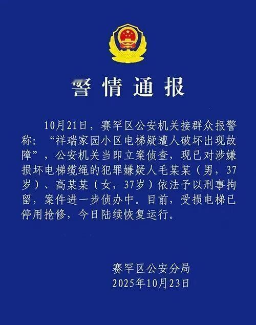 这事儿真是让人后怕——呼和浩特一个小区里,23部电梯的钢绳被人故意割了。要不是检修师傅及时发现,指不定要出多大乱子。 小区总共50部电梯,差不多一半都遭了黑手。检查的时候发现,关键部位的钢绳上全是人为切割的痕迹。这可不是闹着玩的,电梯真要运行起来,钢绳一断,轿厢直接坠落,后果想都不敢想。 好在检修人员够负责,巡查时发现了问题,马上把受损电梯全停了。现在警方已经抓了两个嫌疑人,一男一女,都是37岁,具体动机还在查。 你说这得是多大的仇?要对全小区的人下这种黑手。电梯是每天上下楼的必需品,老人孩子都得用,搞这种破坏简直是在拿人命开玩笑。 现在这些电梯正在抢修,今天开始会陆续恢复使用。但想想都膈应,以后坐电梯心里都得留个阴影。 这种恶意破坏公共安全的行为,必须严惩。警方以涉嫌刑事犯罪把他们拘留,一点不冤。希望法律能给个重判,也让那些想干坏事的人掂量掂量后果。 咱们平时在小区里发现电梯异常,也要多留个心眼。该报修报修,该报警报警,安全问题上可不能马虎。这次要不是检修师傅认真,真等出了事就晚了。