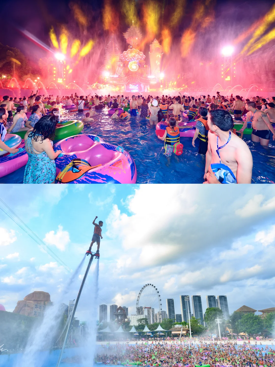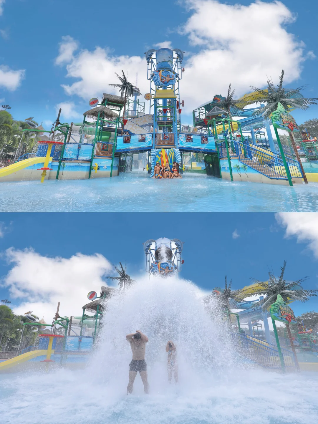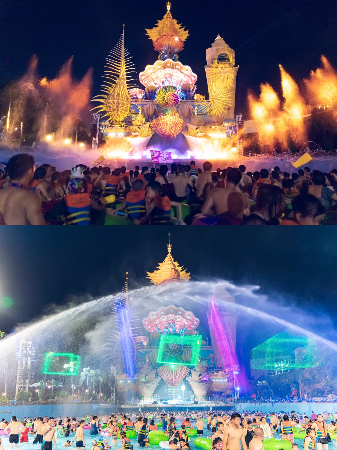 🔹加勒比海滩:有造浪池,体验到海里游玩的刺激却更安全,晚上的裸眼激光水幕大秀也太酷了吧
