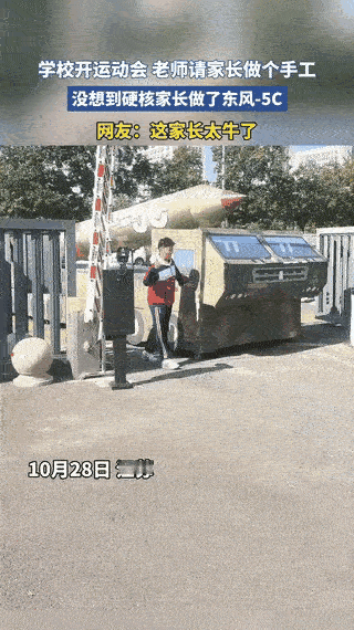 江苏某中学准备开运动会,让家长配合孩子做手工参加展览。有位家长直接手工做出东风-5C导弹模型,连带运输车一起拉到学校。孩子推着模型进校门时,周围学生和家长都凑过来围观。 有网友说这模型太专业,可能是家长当过设计师。也有人说学校本来要求普通手工,现在变成军备竞赛了。还有人夸这是国防教育的好例子。 这模型能打全球目标,现场学生都看得直发愣。最后学校没批评也没表扬,就这么把模型放在展览区了。