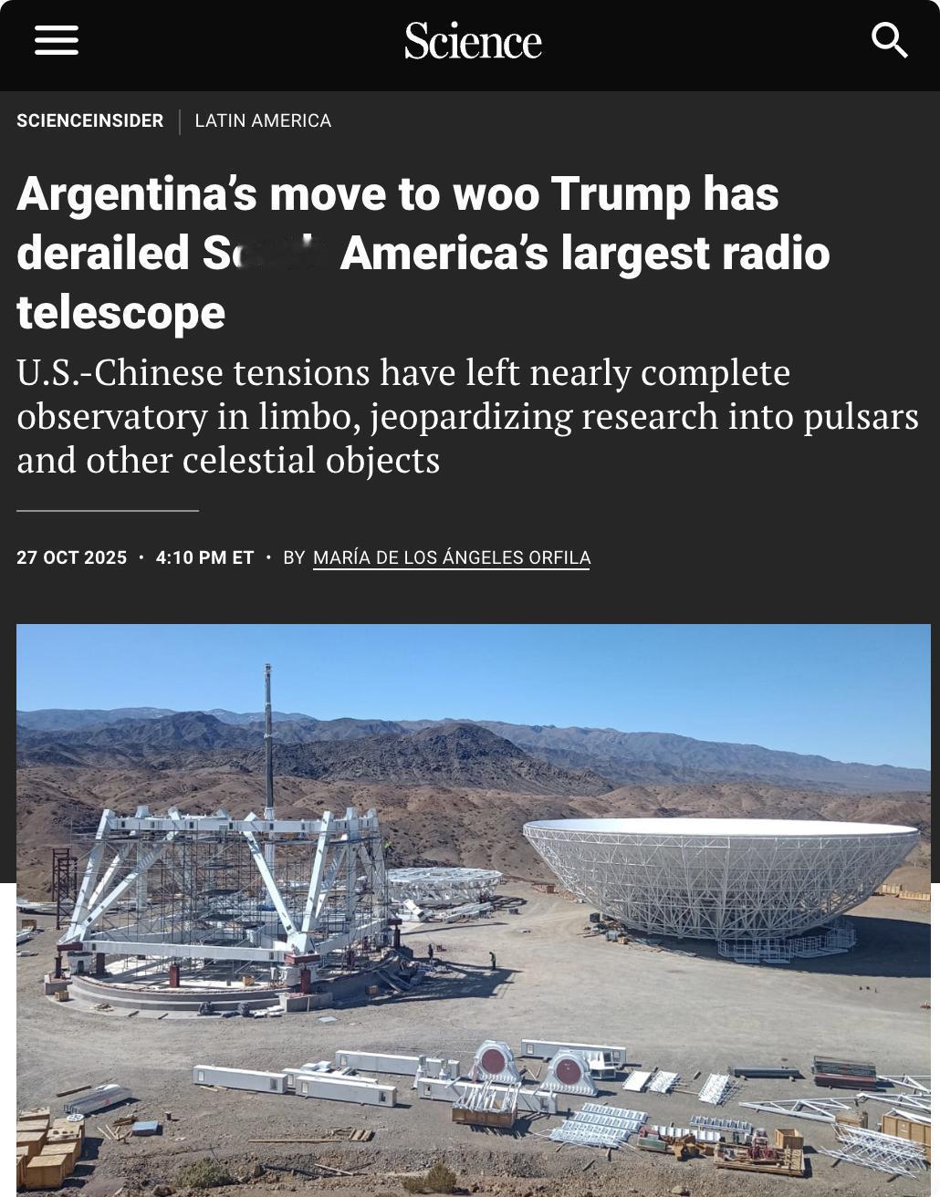 外媒:阿根廷与中国合作建设的南美洲最大射电望远镜(CART)项目因美中关系陷入困境。该项目已完成90%,但由于阿根廷总统试图与美国特朗普政府拉近关系,导致项目受阻。 今年6月,阿方错过与中国续签合作协议的期限;9月,阿海关扣押了中国制造的关键部件;10月,阿政府又要求国防部重新审批该项目,尽管其早在2016年就已获批。 这一系列事件使该望远镜的未来充满不确定性,也让阿根廷天文学界感到沮丧,因为该望远镜本可用于研究脉冲星等天体。
