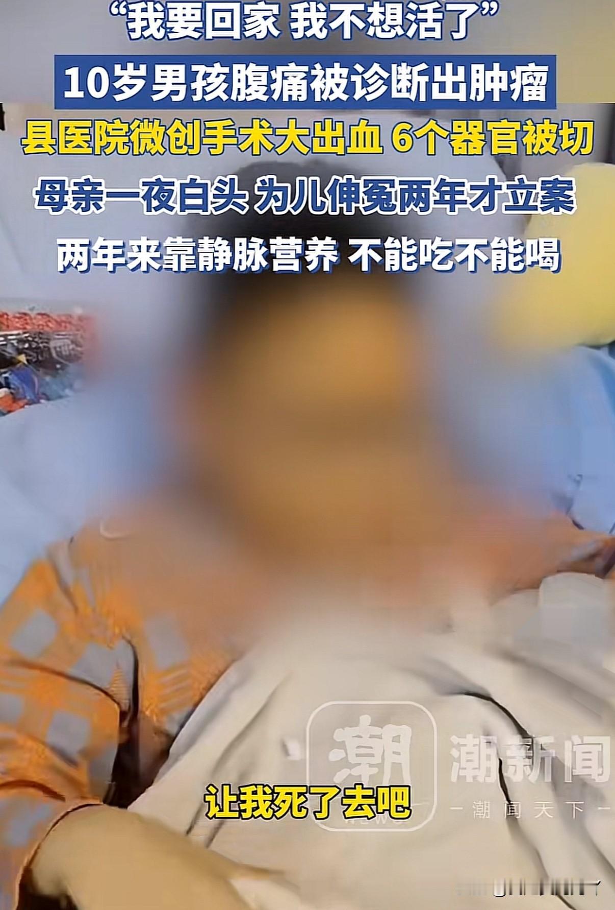 男童县医院做微创手术被切6个器官,如今只能靠注射静脉营养续命,母亲一夜白头奔走两年伸冤终立案 “妈妈让我回家吧,让我死了吧!”10岁男孩小烨因一次意外撞伤在县医院确诊肿瘤,医院表示只需做一个微创小手术就可以治好。谁知手术做了14个小时期间从微创手术到开腹手术,术中大出血家属签了4张病危通知书,最后小烨被切除6个内脏器官,整个消化系统几乎被全切。十二指肠被切,胃切了3/2,结肠剩下不到50厘米,术后不能吃不能喝靠静脉营养注射补充营养,挂排泄袋续命。孩子母亲一夜白头 两年来小烨母亲不懈维权当地卫健委介入表示医院确实存在问题已经立案调查,目前山东菏泽成武县医院赔付了小烨妈妈20万元,但对于小烨的后续康复治疗这点钱是远远不够的,小烨妈妈希望能得到社会各界关注,因为她的视频总被莫名其妙下架 信源:红星新闻、潮新闻 奉劝大家如果查出需手术的重病一定一定要多去几家医院检查,尽量去大型三甲医院复查。多听几位医生建议再做决定,平时买个东西还货比三家呢何况是肿瘤要做手术的病更应该多去几家医院看看