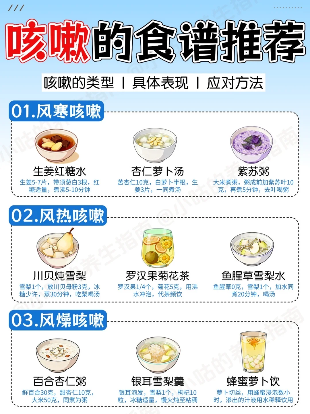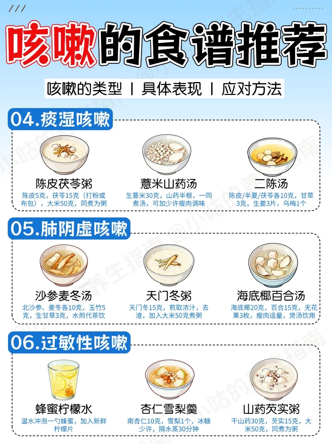 你知道如何区分不同类型的咳嗽么 👉风寒咳嗽 👉风热咳嗽 👉风燥咳嗽 👉湿痰咳嗽 👉肺阴虚咳嗽 👉过敏性咳嗽 针对不同类型的,给大家收集了一些食谱调养! 快分享给你身边的朋友!