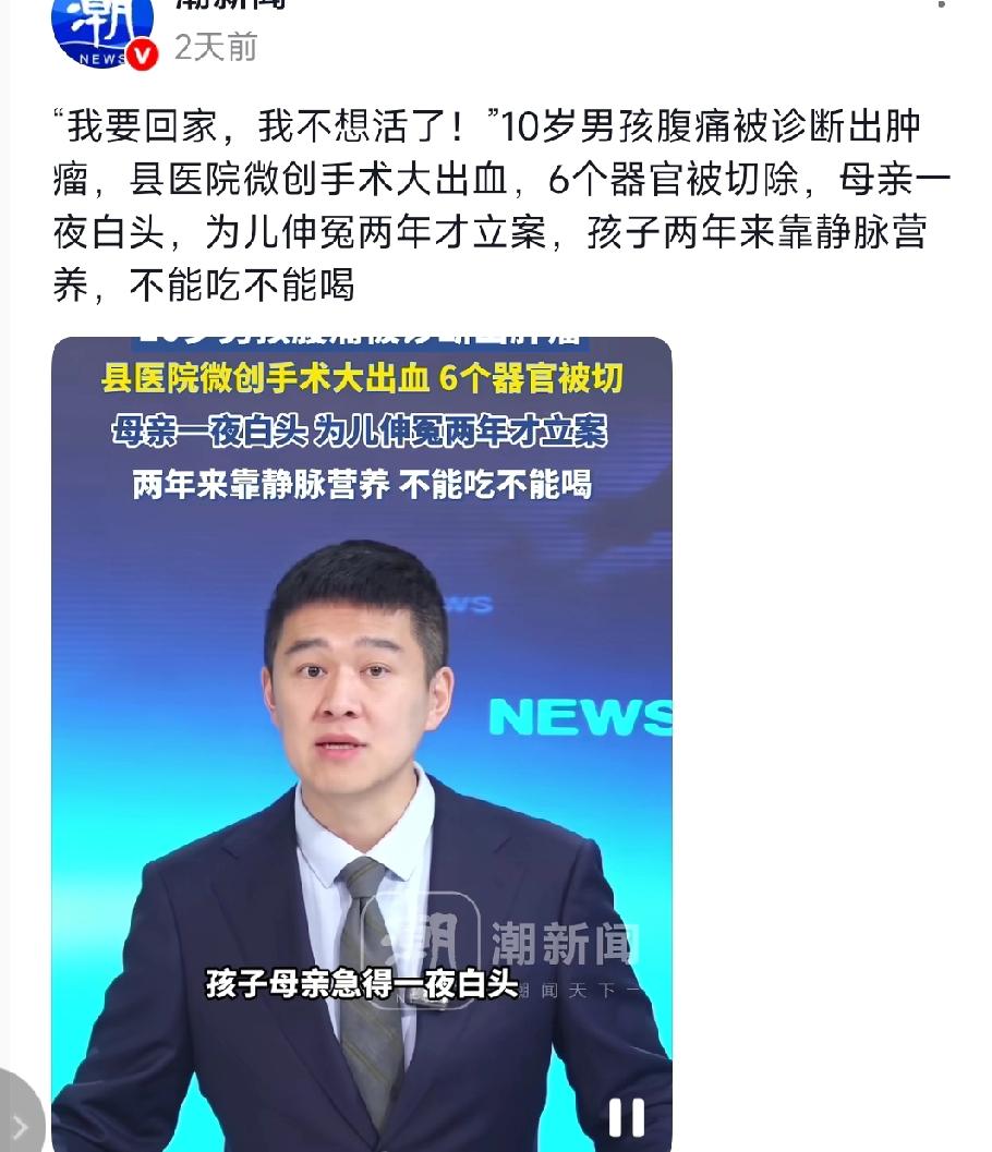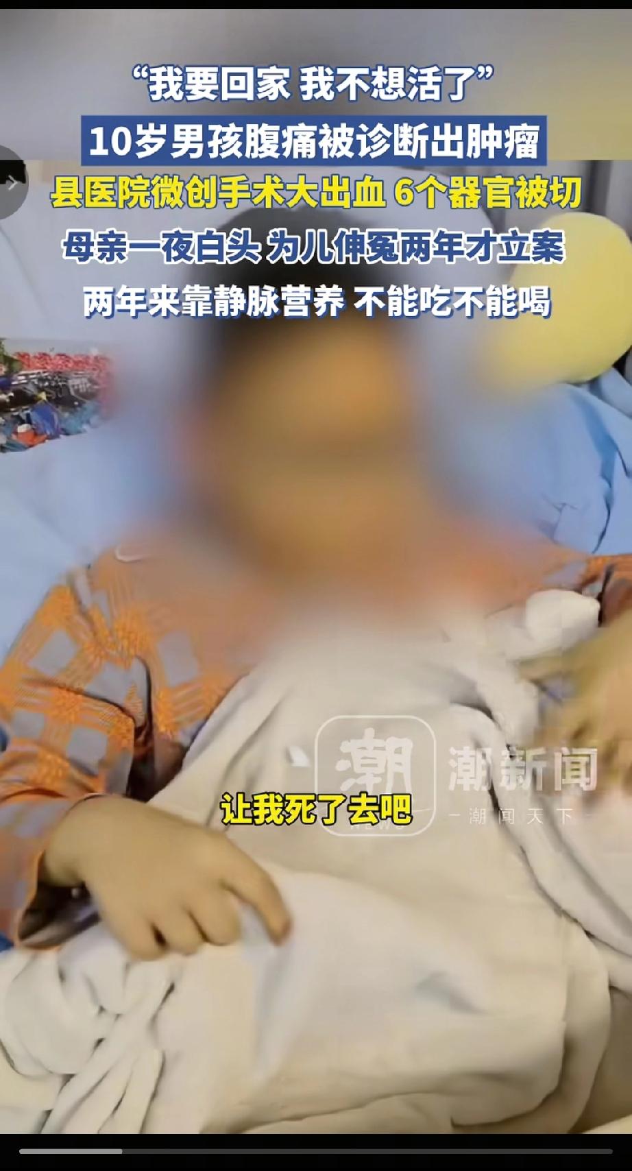 妈妈,我想回家,我不想待在这里,让我死吧。”一个稚嫩又绝望的声音,如针般刺痛着我们的心,而这竟出自一个年仅10岁小男孩之口。原本天真活泼的他,只因一场突如其来的腹痛,命运便被彻底改写。 小男孩被诊断出肚子里长了肿瘤,家人心急如焚又心存一丝希望,将他送进了县医院。当时医生满不在乎地说,这只是个小毛病,做个微创手术就能解决。谁能料到,这看似简单的微创手术,竟成了噩梦的开端。 手术台上,意外突发,大出血的状况如恶魔般袭来。原本计划的微创手术,不得不转为开腹手术,接着又是十二指肠切除术、结肠切除……一场手术,宛如一场无情的风暴,席卷了孩子幼小的身体。家属们心急如焚,在医生“不签字就是不配合医治”的逼迫下,被迫4次签下那沉重的名字。 最终,这场手术让孩子的身体系统几乎遭受了灭顶之灾,6个器官被无情切除。胃被切去了三分之二,结肠只剩下不到50厘米。看着孩子遭受如此折磨,母亲心如刀绞,乌黑的头发竟全白了,仿佛那无尽的忧愁与痛苦,都化作了这满头白发。 此后的两年时光,对孩子而言,每一天都是煎熬。他不能吃,不能喝,只能无奈地挂着排泄带,依靠静脉营养维持那脆弱的生命。那小小的身躯,承受着常人难以想象的痛苦,他常常哭着说:“我不要再戴这个了,让我死了去吧。”每一句话,都像一把利刃,刺痛着母亲的心。 好在,正义或许会迟到,但不会缺席。山东成武卫健局认定医院存在问题,已经立案调查。红星新闻10月29日从孩子母亲岳女士那里获悉,当时那场手术,竟然持续了将近14个小时。这漫长的14个小时,对于孩子和家人来说,每一分每一秒都是煎熬。 目前,县医院已经赔偿了20万元,县卫生健康局也在紧锣密鼓地进行立案调查。我们真心希望,这样的悲剧不要再上演,也期待调查能早日有一个公正的结果,还孩子和家人一个公道,让这个饱受磨难的家庭早日好起来!