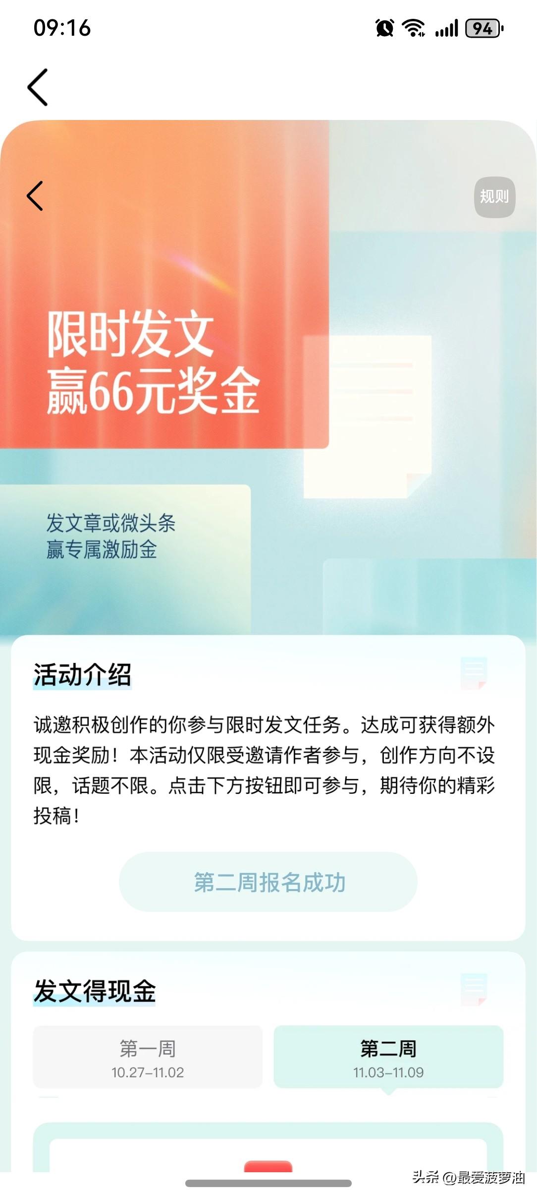 参加了“限时发文赢66元奖金”的第二周, 每天都在为阅读量发愁! 今天的流量更是被按在地上摩擦, 从早上到现在, 发了2条微头条和一篇文章, 展现量都不过千, 阅读量也是异常低迷! 明天就是活动的最后一天了! 不得不再努力一下, 发多几条! 希望能够达标就行了, 别的也不敢想了! 参加活动的小伙伴们! 一起加油吧!