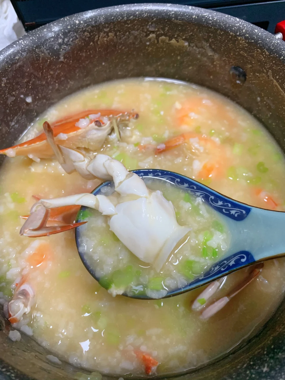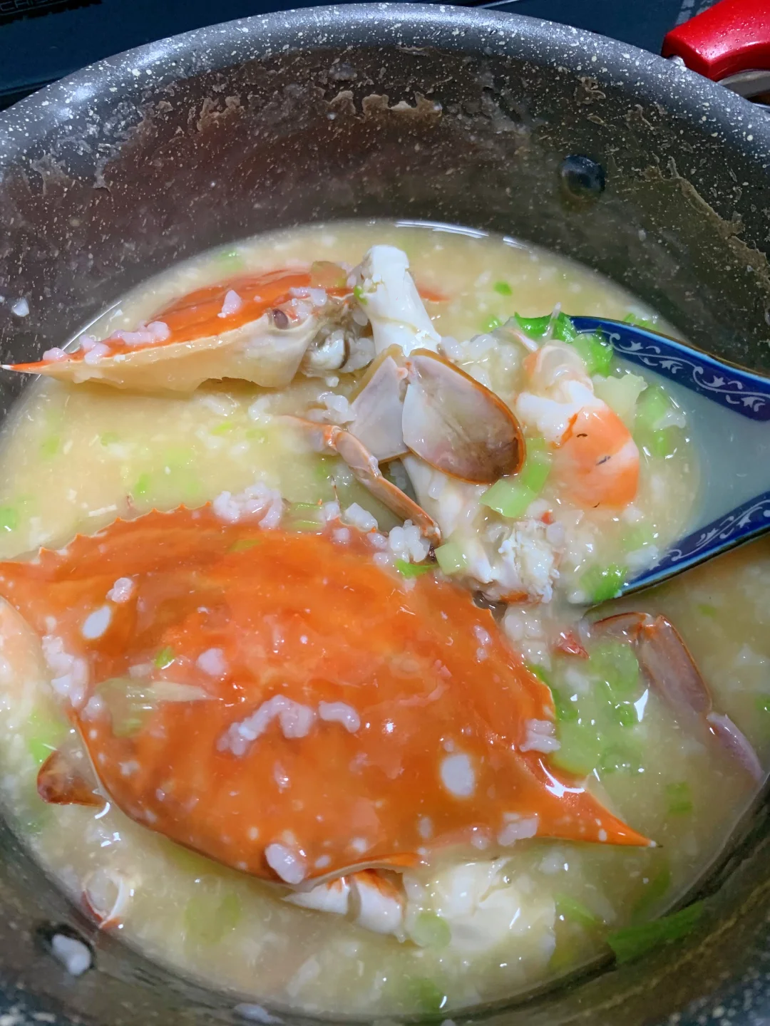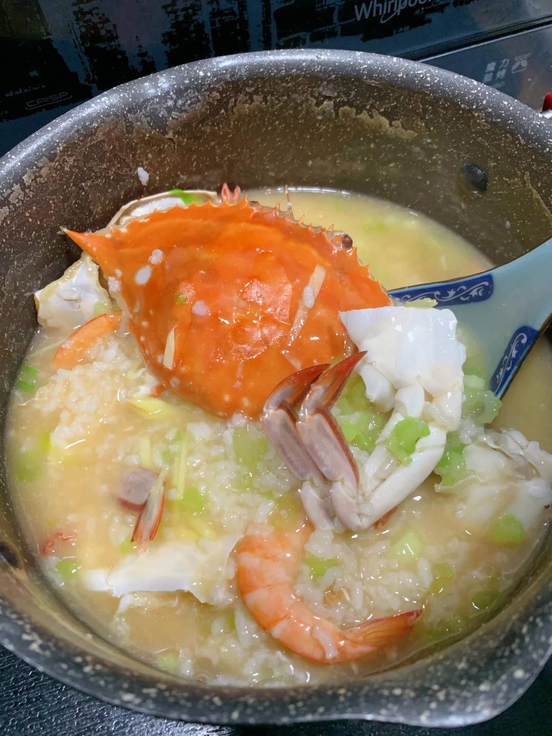 4️⃣粥煮好倒入虾油,少许姜丝(可放可不放)倒入螃蟹煮2分钟,倒入大虾,虾变色即可(不要煮久了 不然不Q弹)中途记得搅拌 最后倒入芹菜丁 翻搅几下就关火 芹菜脆脆的才好吃 最后加入适量的胡椒粉即可(鸡精看个人喜欢)主包没有加 已经很鲜了 大冬天来上一碗 真的巨巨巨巨好喝