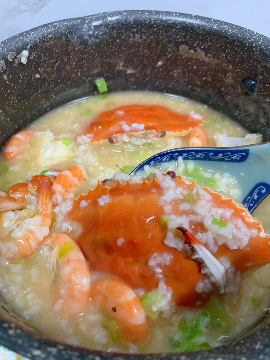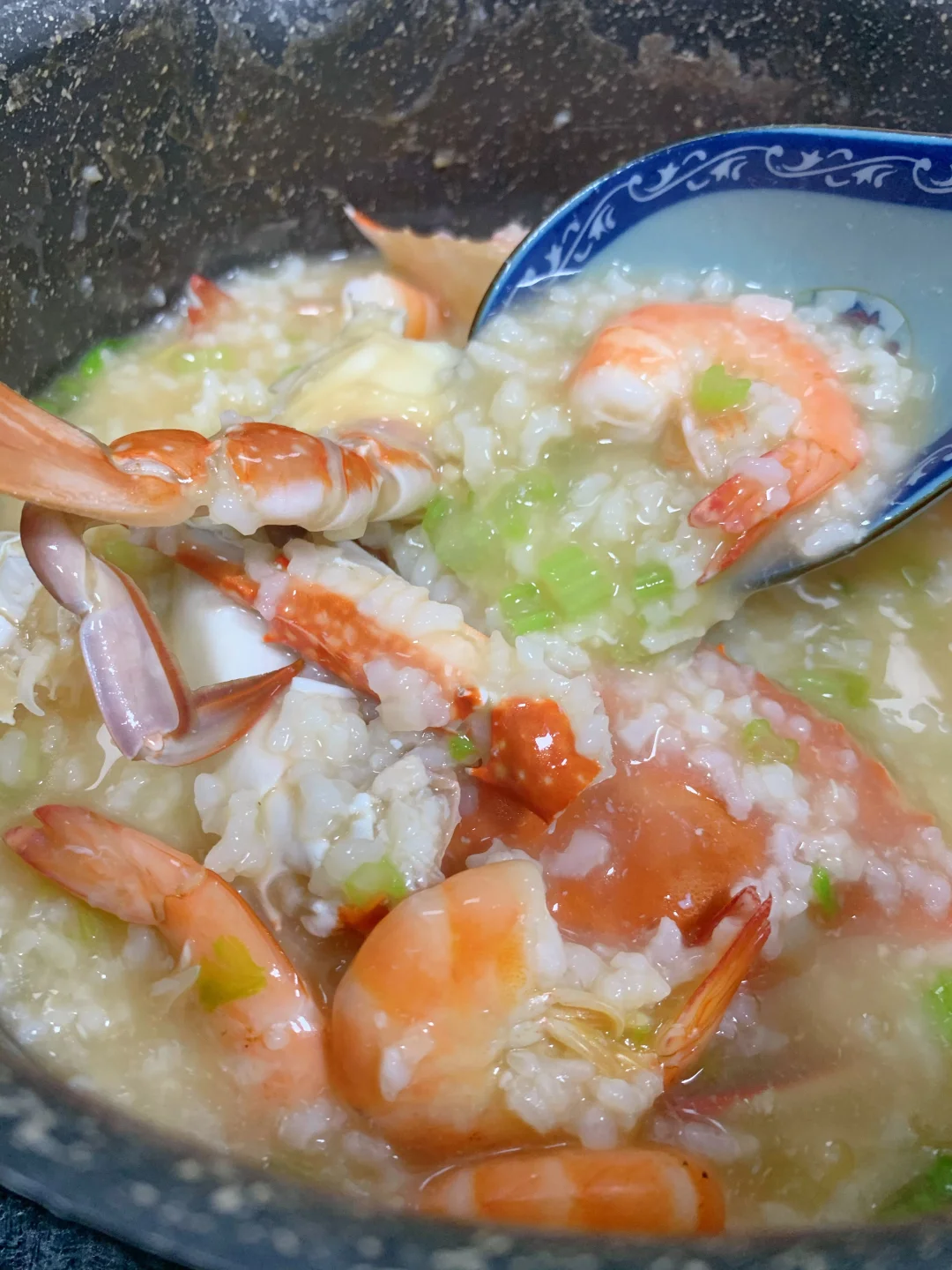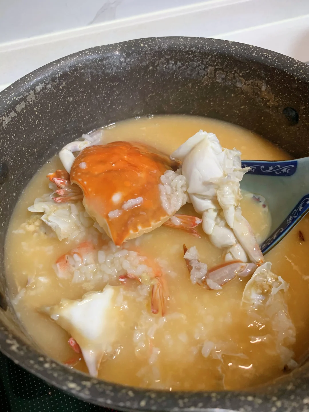 4️⃣粥煮好倒入虾油,少许姜丝(可放可不放)倒入螃蟹煮2分钟,倒入大虾,虾变色即可(不要煮久了 不然不Q弹)中途记得搅拌 最后倒入芹菜丁 翻搅几下就关火 芹菜脆脆的才好吃 最后加入适量的胡椒粉即可(鸡精看个人喜欢)主包没有加 已经很鲜了 大冬天来上一碗 真的巨巨巨巨好喝