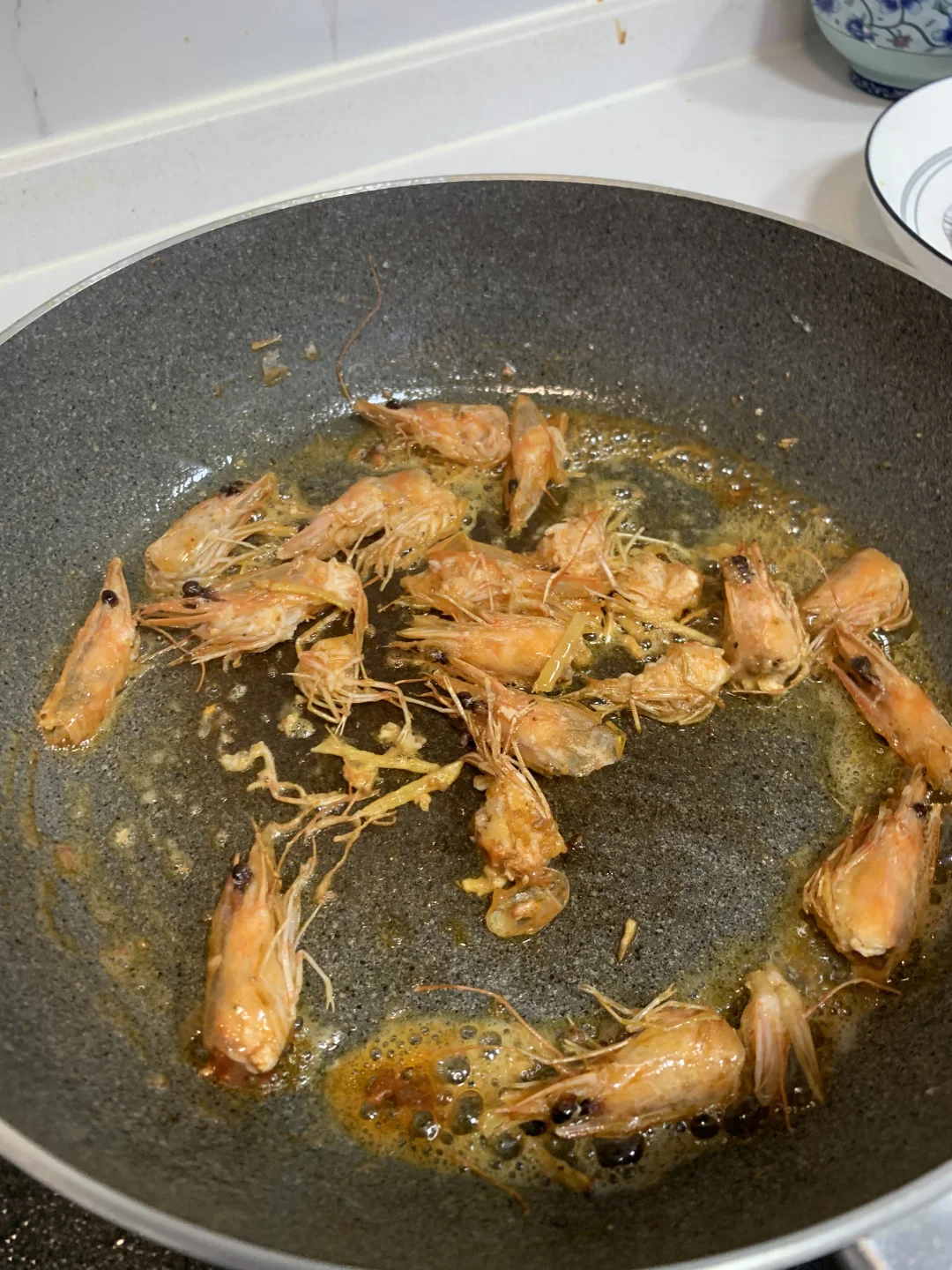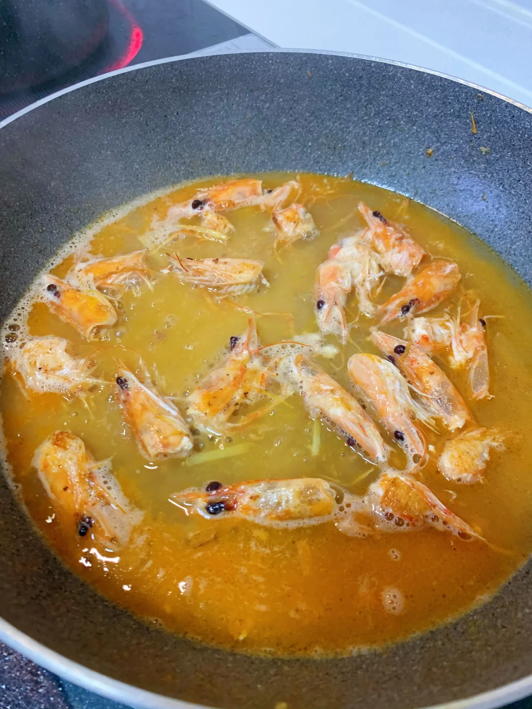 3️⃣锅内少油倒入虾头 姜丝煎至金黄 中途用锅铲压出虾油,倒入清水熬煮几分钟,沥干净虾渣备用