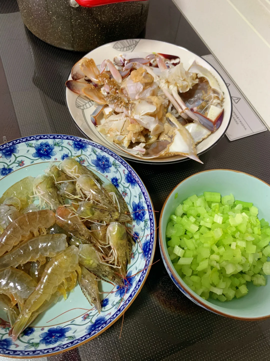 ♨️准备食材:螃蟹🦀虾🦐芹菜 生姜🫚