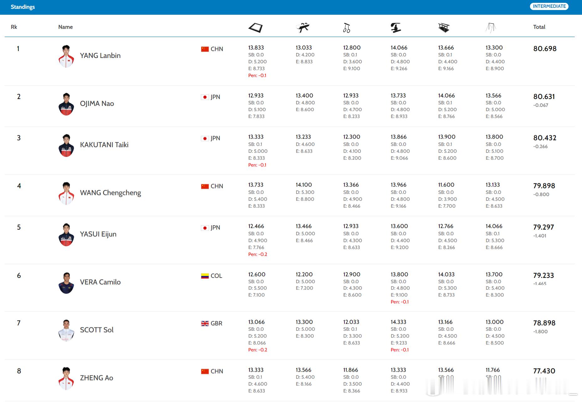 世青赛男子资格赛前两场比赛结束。中国队以163.095分暂列团体首位,日本队暂列第二(162.429),英国队第三(158.529)。新秀小将杨兰斌凭借高质量的稳定发挥,以80.698分暂列全能首位,同时暂列自由操第一(5.2+8.733-0.1)、双杠第六(4.4+9.166+0.1)、单杠第六(4.4+8.9)和吊环第七(3.6+9.1)。王呈丞暂列全能第四(79.898),同时暂列鞍马和吊环第一(5.3+8.8,4.9+8.466)、自由操第二(5.4+8.333)。郑奥暂列全能第八(77.43),同时暂列鞍马第三(5.4+8.166)和双杠第七(4.5+9.066),自由操也排名第三但已队内淘汰(4.6+8.633+0.1)。之后还有剩余两场的比赛。
