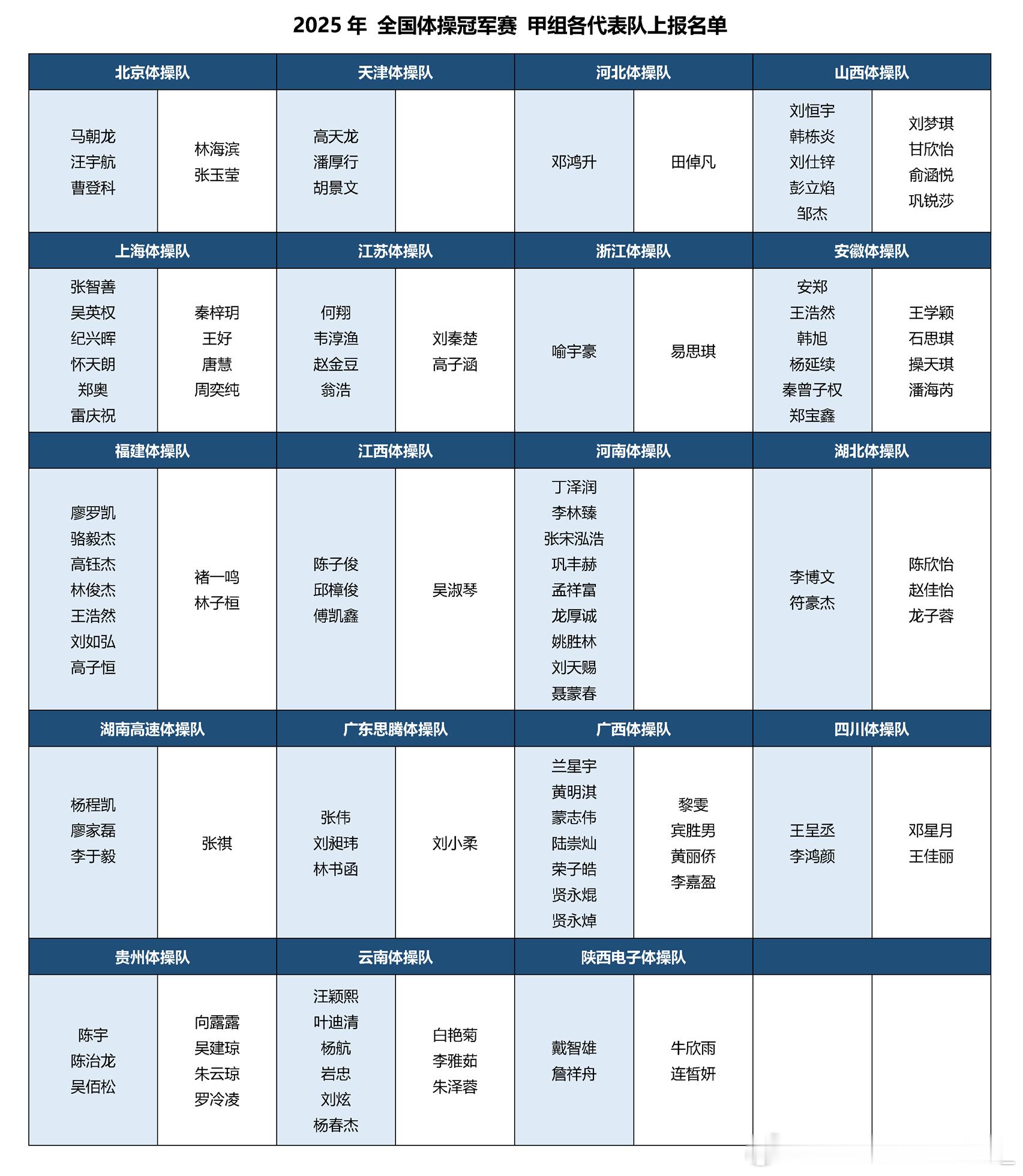 全国体操冠军赛将于12月9-12日在江苏南通举行。比赛分为甲组(即各省的专业队)和乙组(大致可理解为业余大学生组)两部分。资格赛男女同时进行,前三轮男子比自由操、鞍马和吊环,女子比跳马和高低杠(每队轮空一轮);后三轮男子比跳马、双杠、单杠,女子比平衡木和自由操(每队轮空一轮)。甲组只比资格赛和单项决赛,资格赛直接决定全能和多项全能排名;乙组只比蹦床和资格赛,资格赛直接决定全能和单项排名。赛程及各队上报名单如图(但报名了未必都会参赛)。