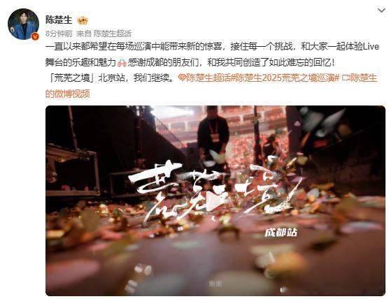 陈楚生希望在每场巡演中能带来新的惊喜陈楚生感谢成都的朋友们陈楚生感谢成都朋友们的支持!“荒芜之境” 巡演不断突破,唱跳技能 + 高科技舞美,让每场都充满新鲜感。