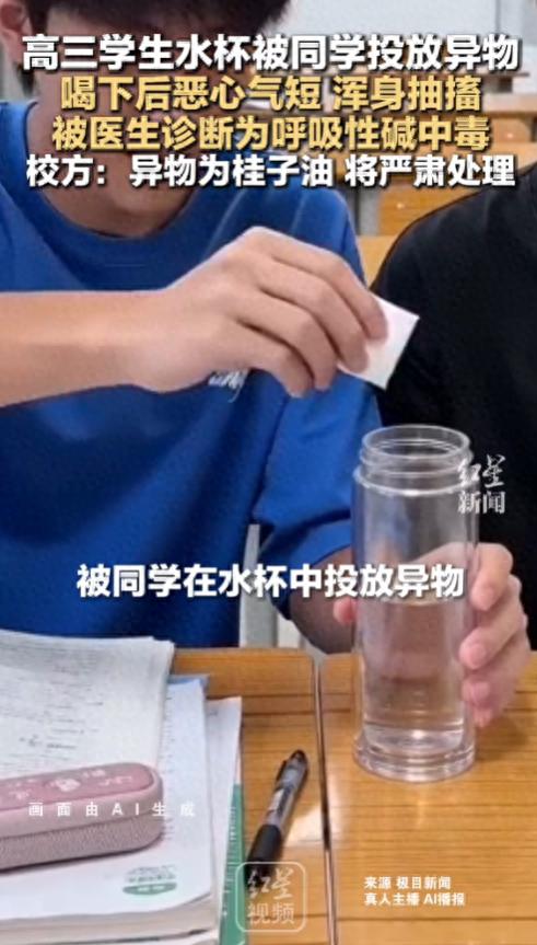 红星新闻:高三学生水杯被同学投放异物 喝下后恶心气短 浑身抽搐 被医生诊断为呼吸性碱中毒 校方:异物为桂子油 将严肃处理