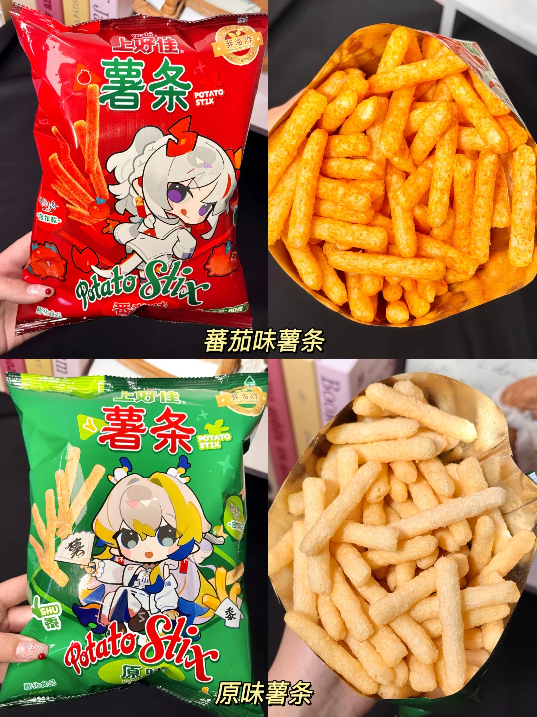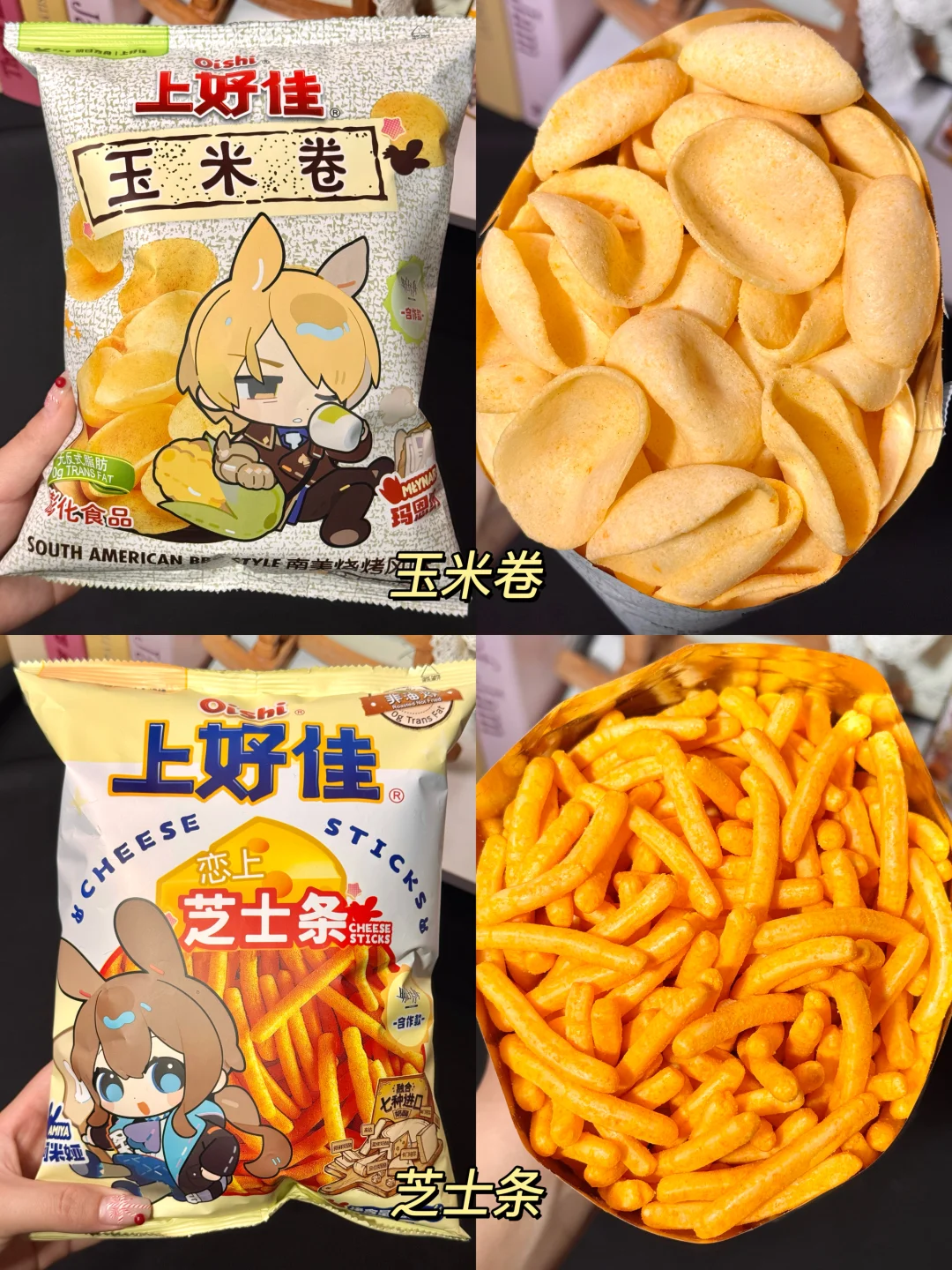 兔兔的芝士条、叔叔的玉米卷、黍姐的原味薯条、小年的番茄味薯条、52的海苔味日式鱼果,蒂蒂的甜辣味日式鱼果、益达的蟹味逸族、小火龙的嗲得薯片