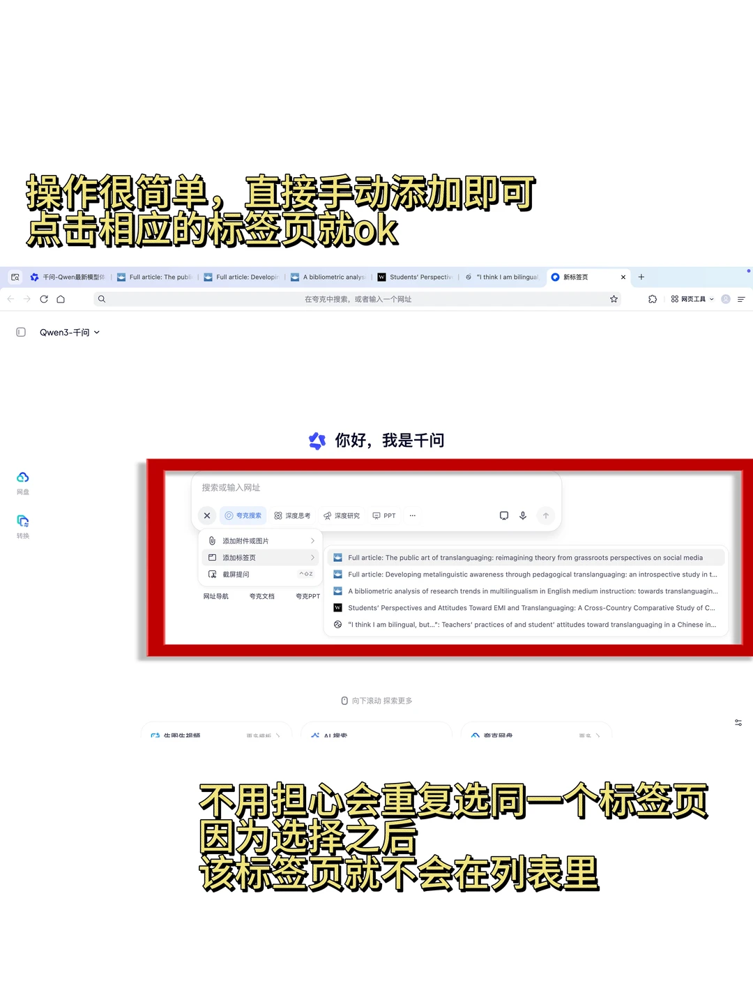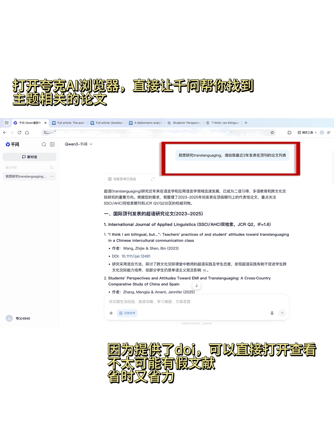 1.用夸克AI浏览器,直接问千问,找到研究主题相关的文献,因为提供了DOI,很少会有假文献,也省出漫无目的找文献的时间。可以用到的提示词是:我想研究translanguaging,请给我近3年发表在顶刊的论.文列表