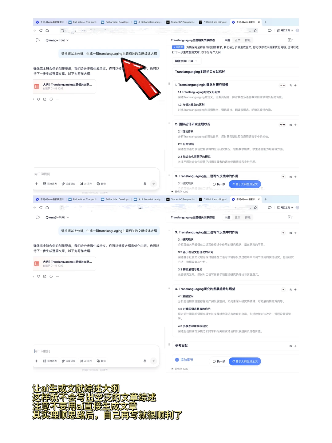 3.让千问直接根据上面的分析,生成文献综述大纲,可用的提示词是:请根据以上分析,生成一篇translanguaging主题相关的文献综述大纲真的太方便了,文献综述变成了很有创意的工作。当然要注意使用方法,可以用AI找资料,brainstorming,但不要让AI代劳写文章哦。