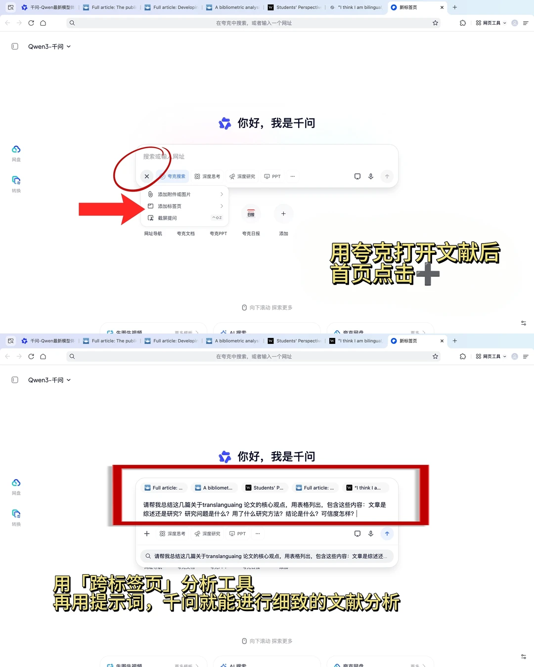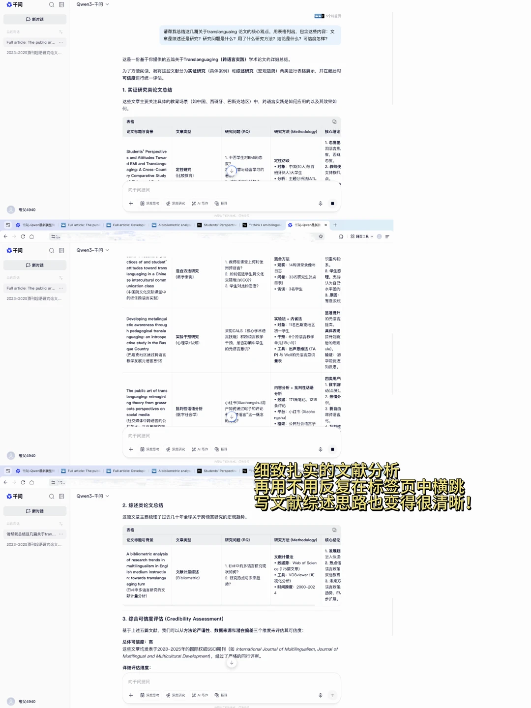 2.打开文献,然后用跨标签分析工具,将相关文献的标签页放在一起,之后再输入类似提示词:请帮我总结这几篇关于translanguaing 论.文的核.心观点,用表格列出,包含这些内容:文章是综述还是研究?研究问题是什么?用了什么研究方法?结论是什么?可信度怎样?
