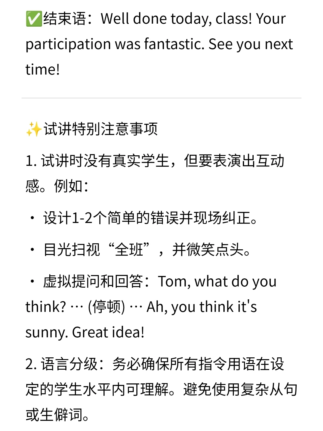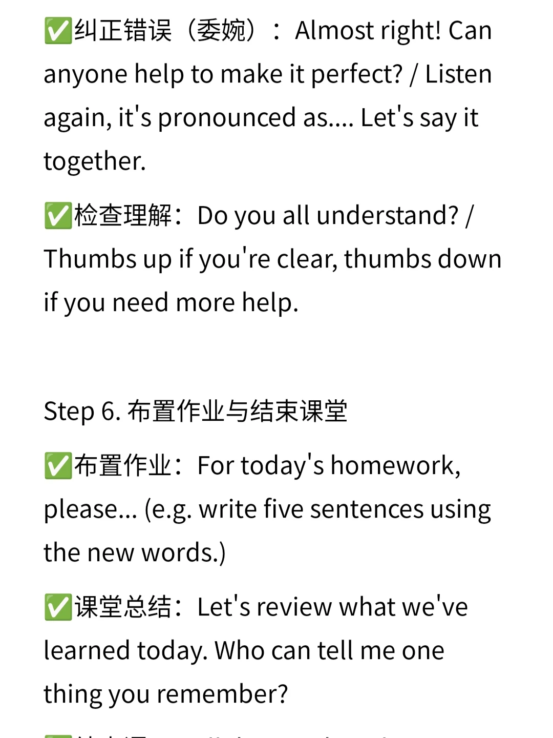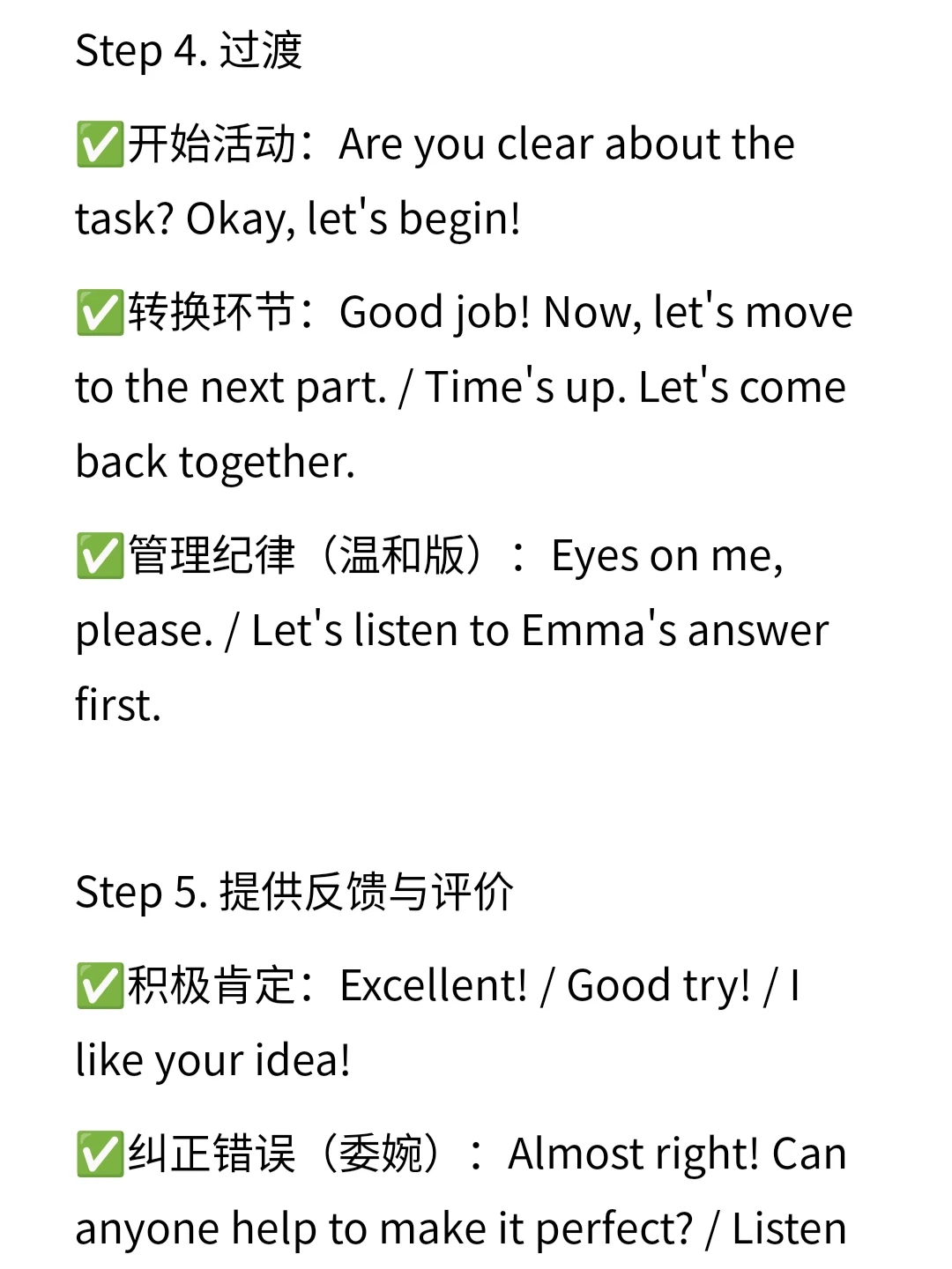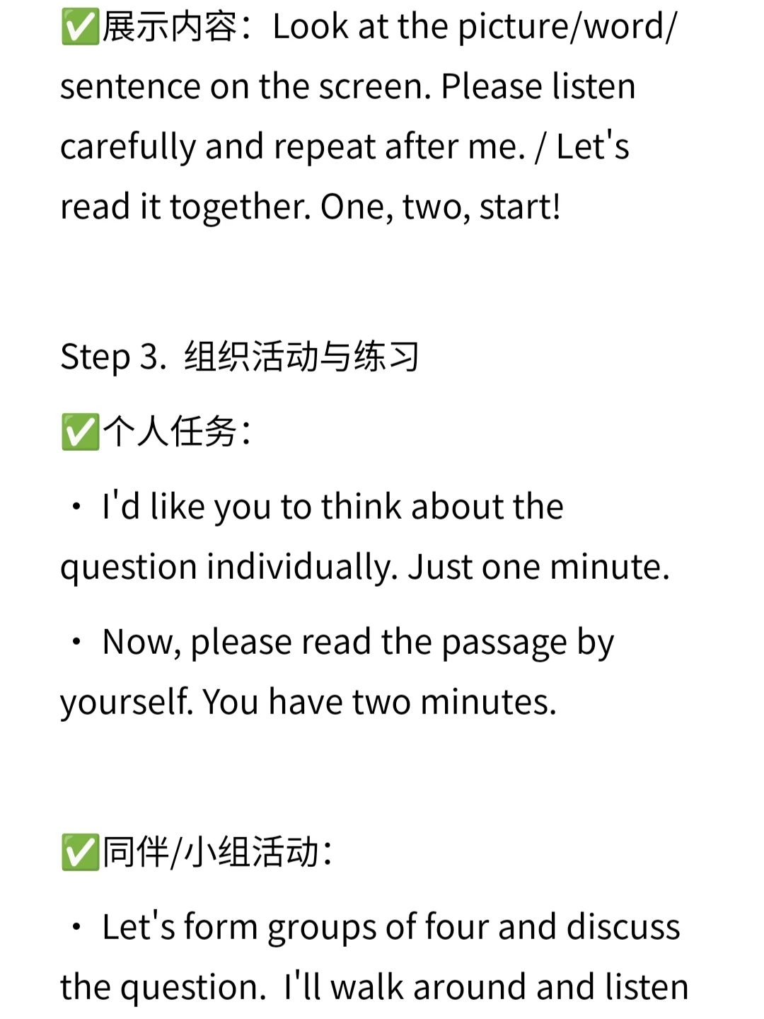 ✅展示内容:Look at the picture/word/sentence on the screen. Please listen carefully and repeat after me. / Let's read it together. One, two, start!