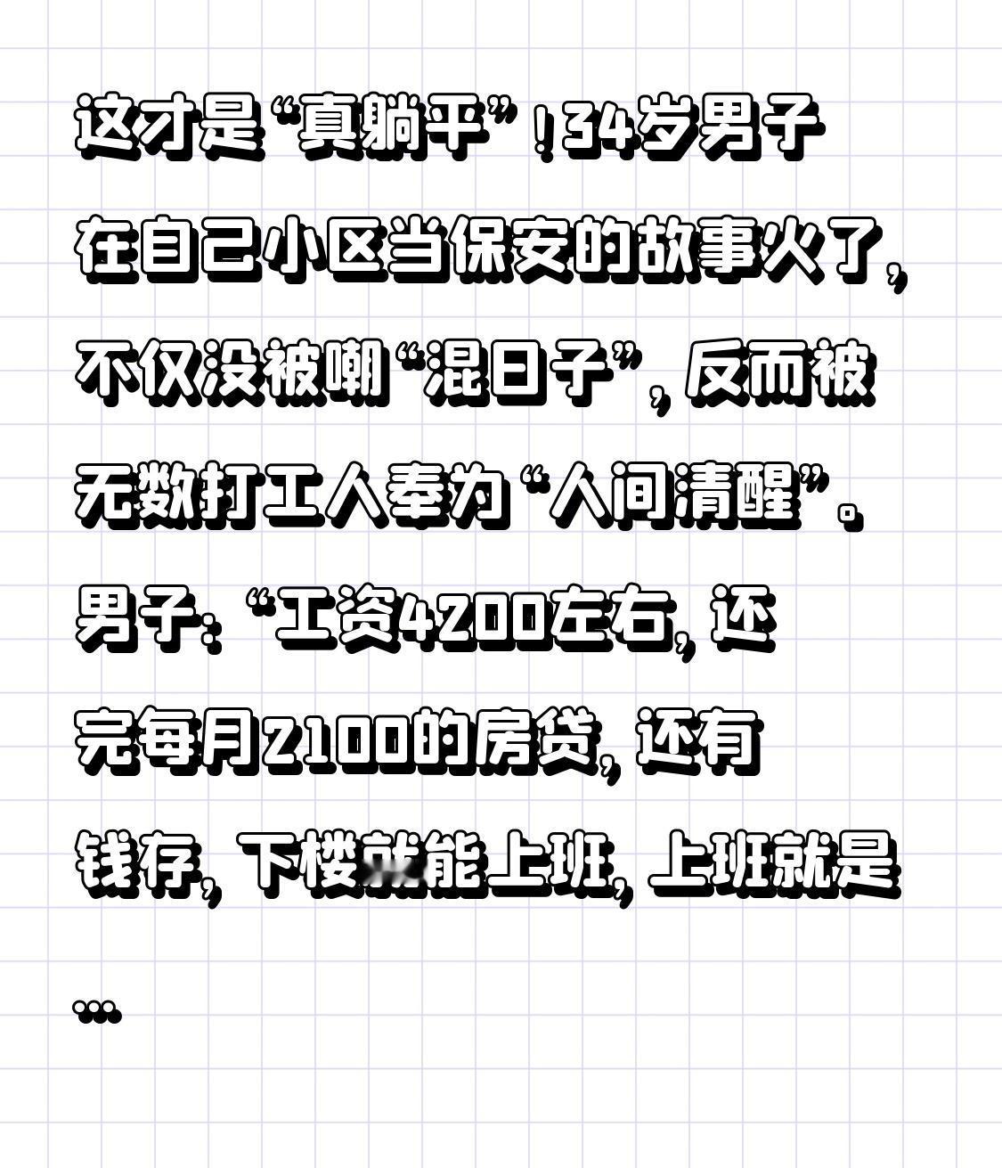 这才是“真躺平”!34岁男子在自己小区当保安的故事火了,不仅没被嘲“混日子”,反而被无数打工人奉为“人间清醒”。男子:“工资4200左右,还完每月2100的房贷,还有钱存,下楼就能上班,上班就是玩手机!网友:牛逼,打开了我的新思路!”