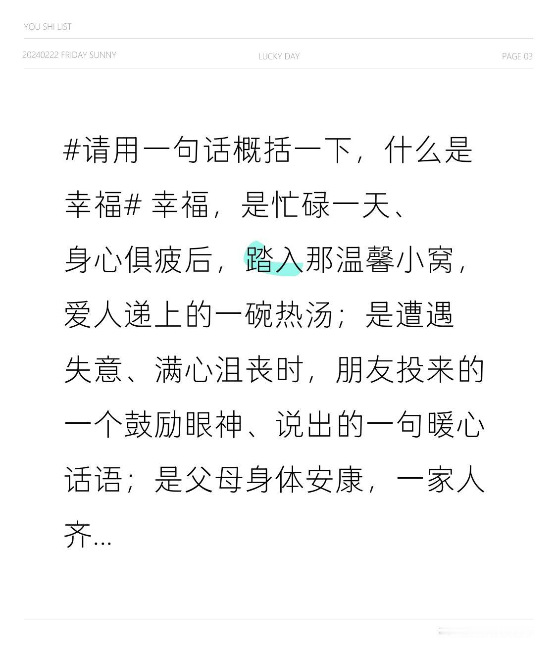 幸福,是忙碌一天、身心俱疲后,踏入那温馨小窝,爱人递上的一碗热汤;是遭遇失意、满心沮丧时,朋友投来的一个鼓励眼神、说出的一句暖心话语;是父母身体安康,一家人齐聚餐桌,共享美味佳肴、畅聊家长里短;是达成目标之际,内心油然而生的那份满足与自豪。幸福,是生活中无数平凡却珍贵瞬间的集合。