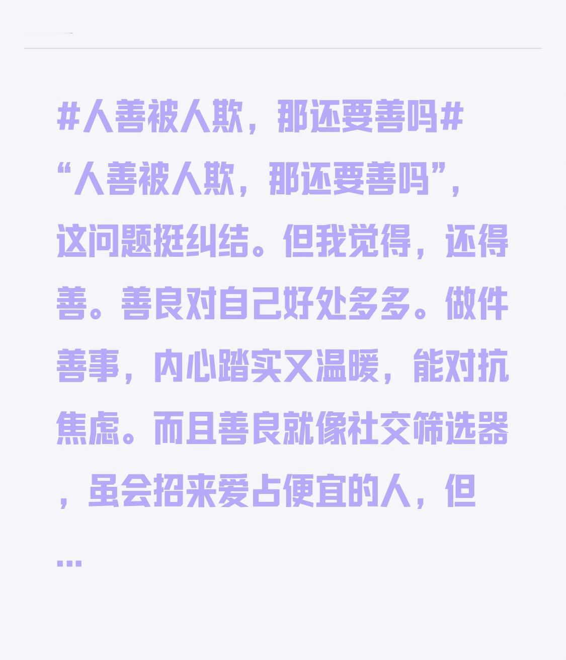 “人善被人欺,那还要善吗”,这问题挺纠结。但我觉得,还得善。