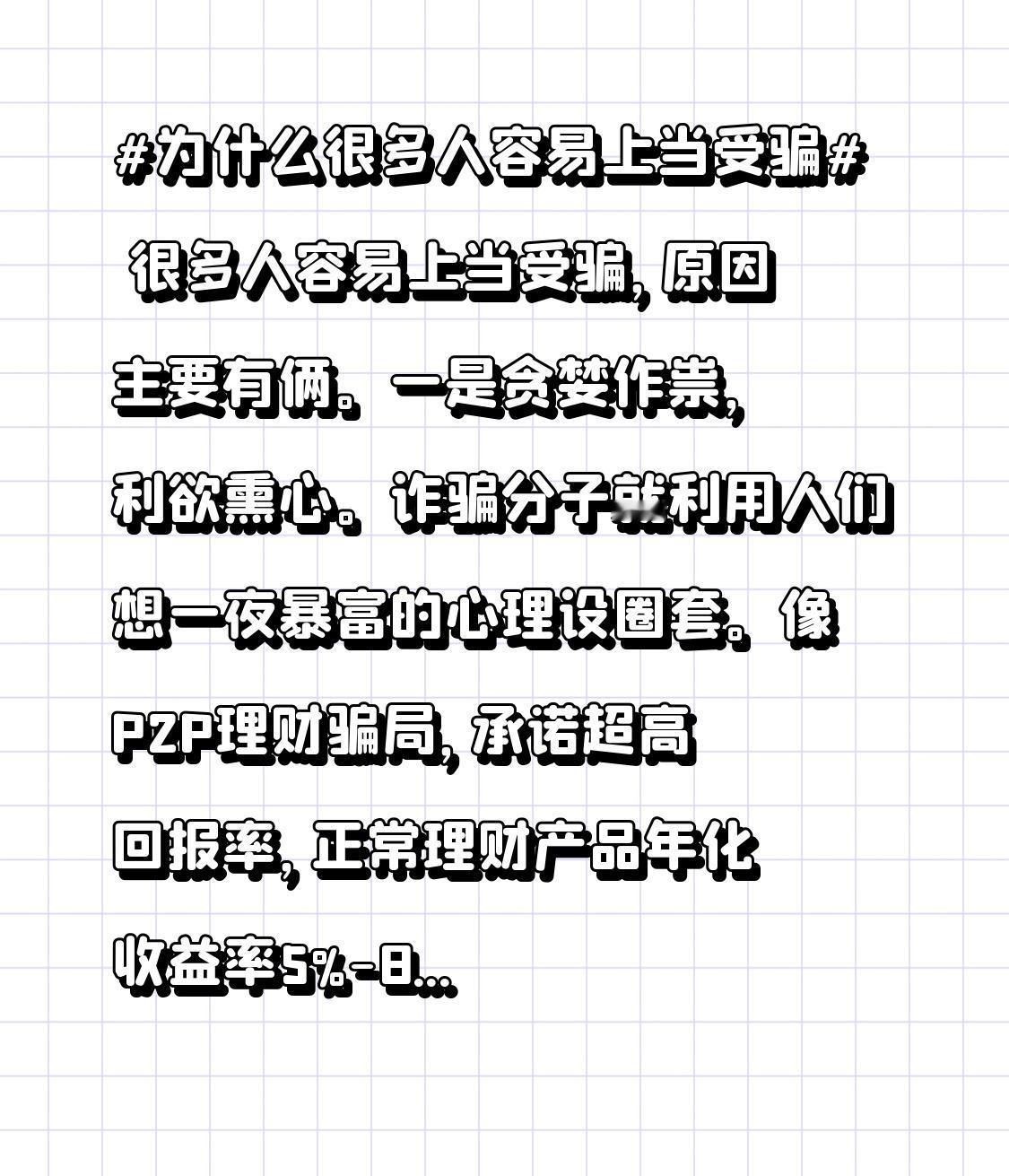 很多人容易上当受骗,原因主要有俩。一是贪婪作祟,利欲熏心。诈骗分子就利用人们想一夜暴富的心理设圈套。像P2P理财骗局,承诺超高回报率,正常理财产品年化收益率5%-8%就不错,可它能到20%甚至更高。P2P爆雷潮时,超5000万投资者受损,损失数千亿。还有街头刮刮乐中大奖、网上低投入高收益理财,都是利用贪心。