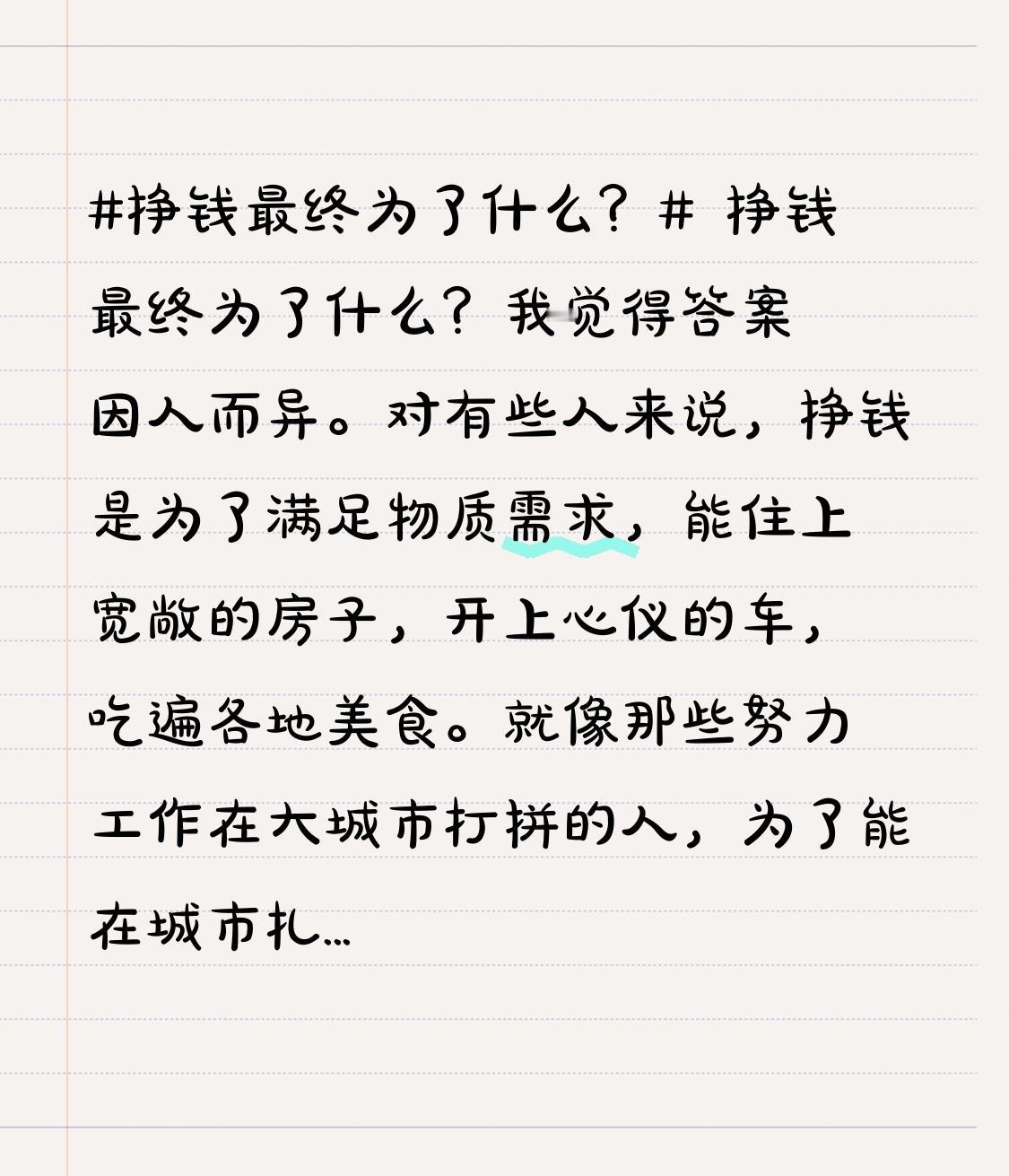 挣钱最终为了什么?我觉得答案因人而异。对有些人来说,挣钱是为了满足物质需求,能住上宽敞的房子,开上心仪的车,吃遍各地美食。就像那些努力工作在大城市打拼的人,为了能在城市扎根,拼命挣钱付首付。