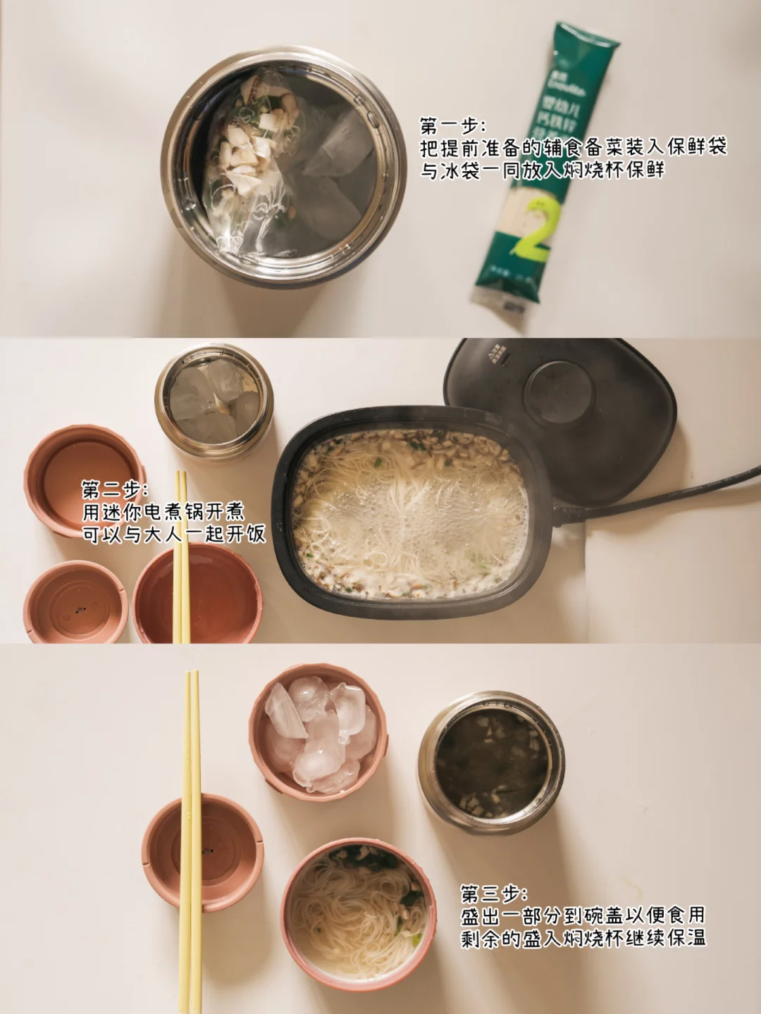 1. 提前将准备好的辅食备菜装入保鲜袋,与冰袋一同放入焖烧杯保鲜