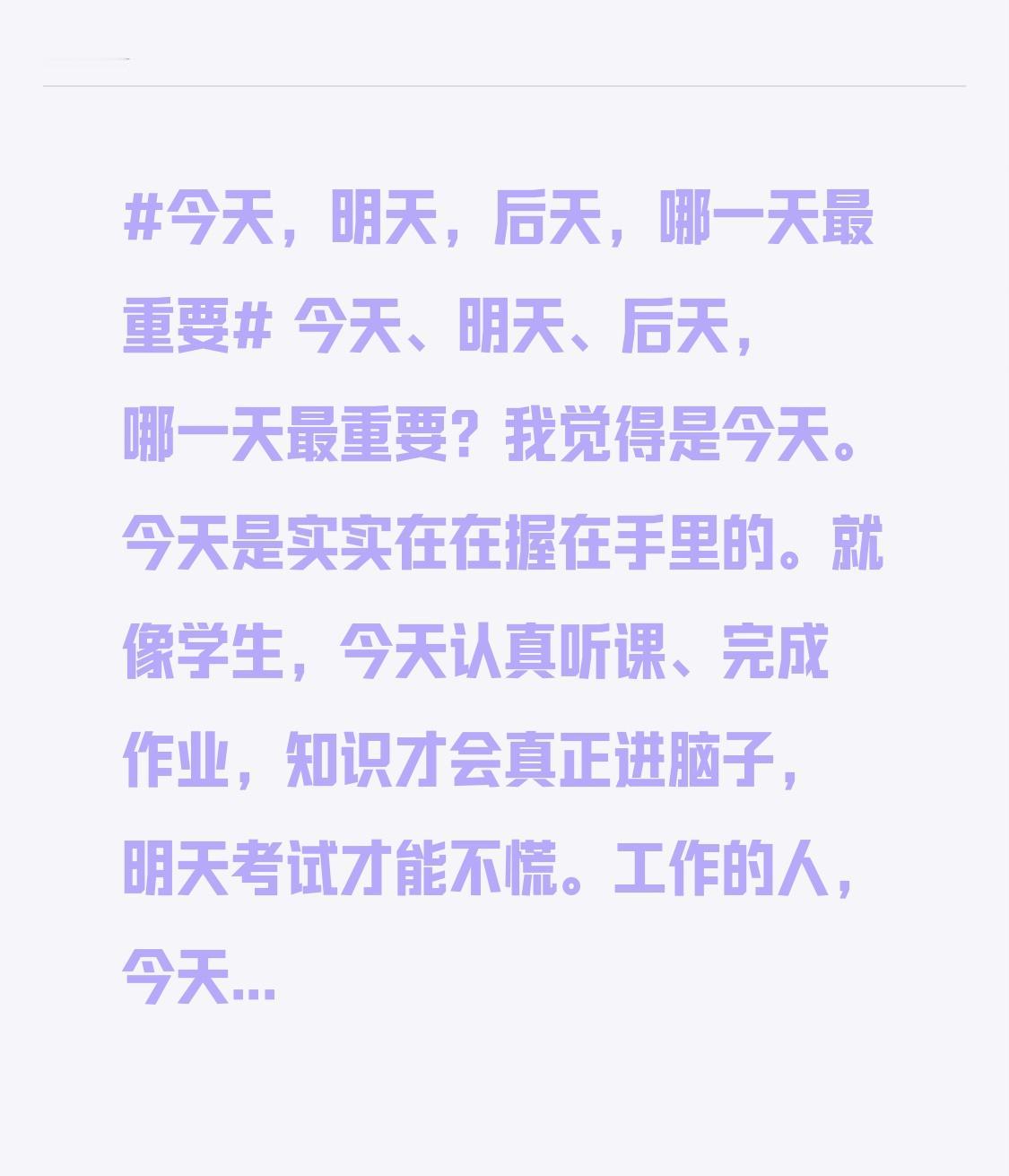 今天是实实在在握在手里的。就像学生,今天认真听课、完成作业,知识才会真正进脑子,明天考试才能不慌。工作的人,今天把任务高效完成,业绩才会一点点积累。如果总想着明天再做,那明天复明天,事情永远堆着。后天看似充满希望,可没有今天的努力,后天也只是空中楼阁。所以别老盼着明天后天,抓住今天,把每一个当下过好,才是最重要的。