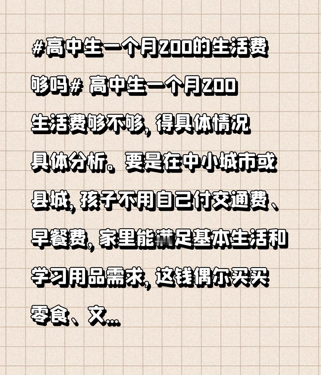 高中生一个月200生活费够不够,得具体情况具体分析。要是在中小城市或县城,孩子不用自己付交通费、早餐费,家里能满足基本生活和学习用品需求,这钱偶尔买买零食、文具,或许还凑合。