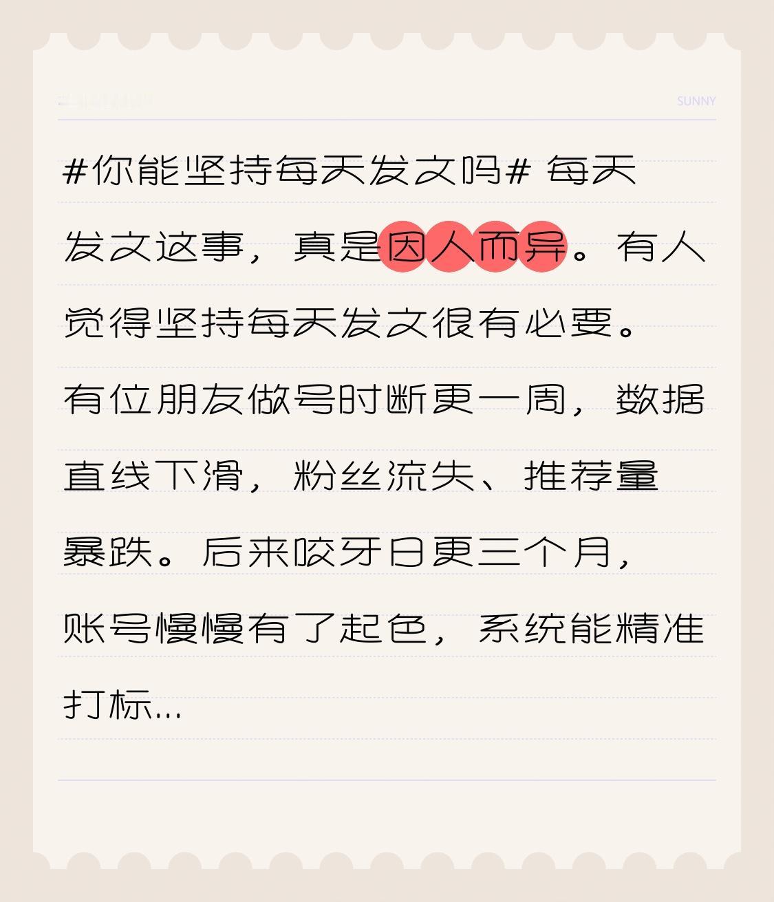 每天发文这事,真是因人而异。有人觉得坚持每天发文很有必要。有位朋友做号时断更一周,数据直线下滑,粉丝流失、推荐量暴跌。后来咬牙日更三个月,账号慢慢有了起色,系统能精准打标,读者也记住了风格,一些日常分享还能引发共鸣,推荐量蹭蹭涨。