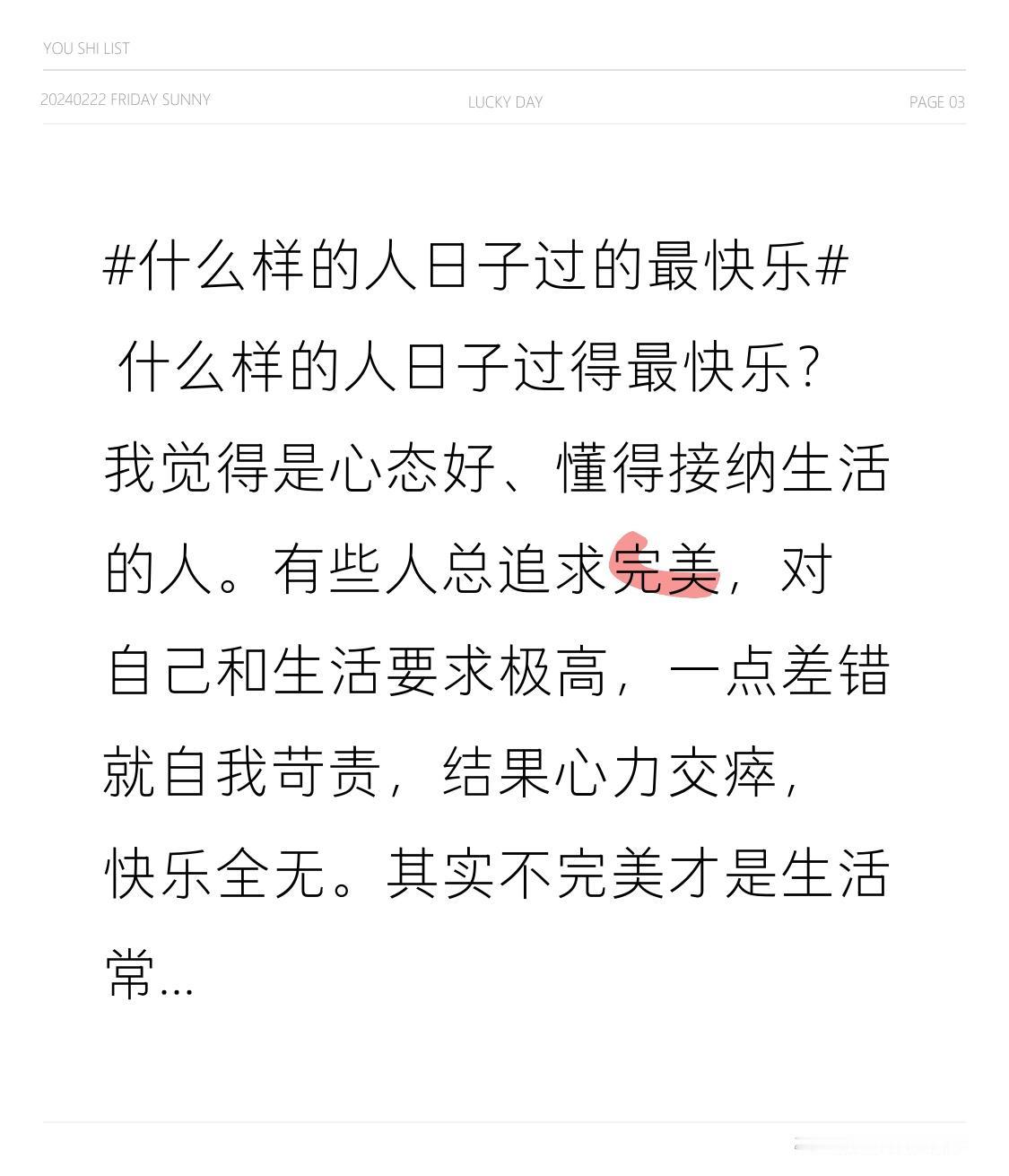 有些人总追求完美,对自己和生活要求极高,一点差错就自我苛责,结果心力交瘁,快乐全无。其实不完美才是生活常态,一次失误的选择、一段有遗憾的关系,都是人生必经。接纳不完美,不纠结过往、不焦虑未来,才能热爱生活。