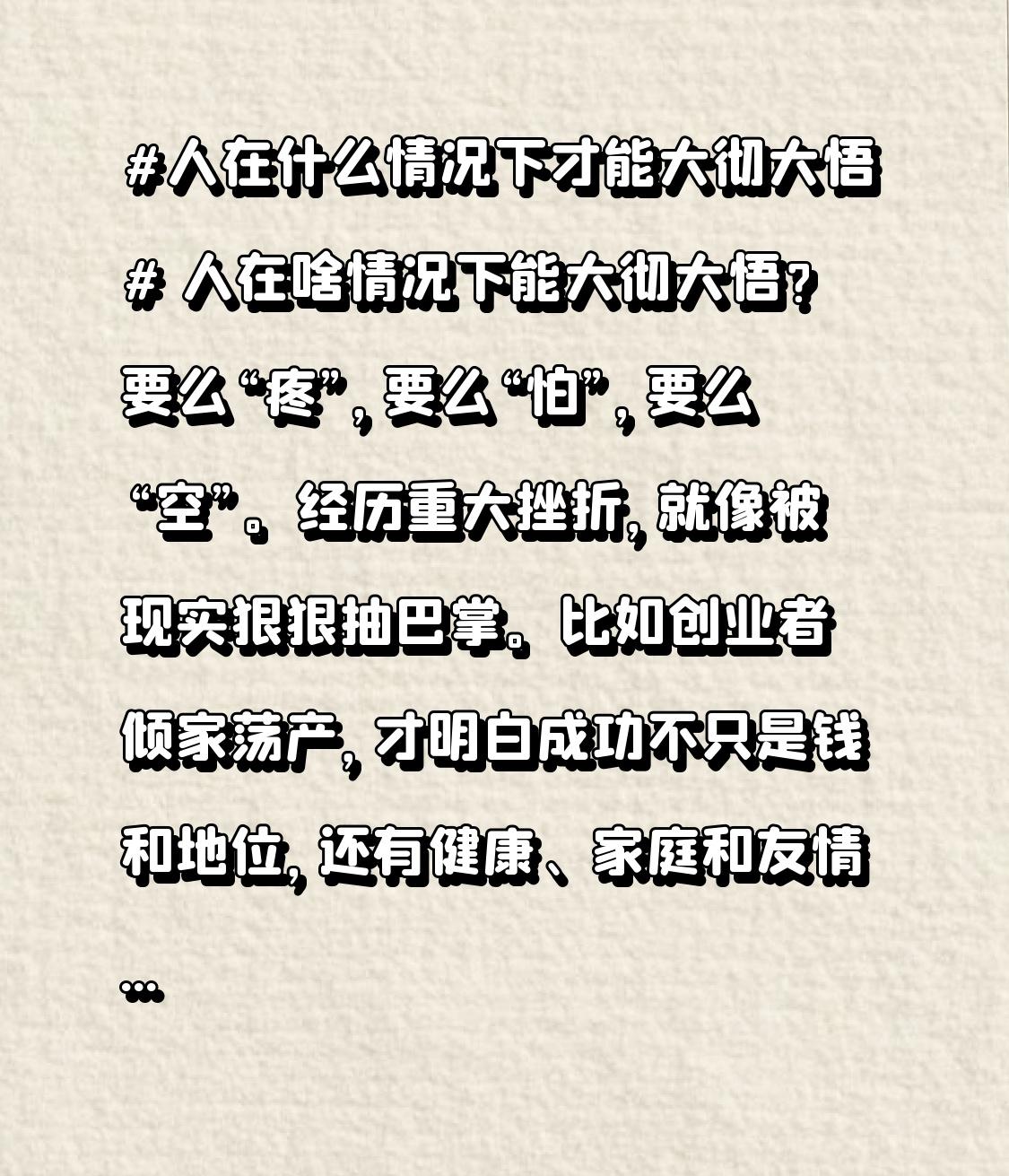经历重大挫折,就像被现实狠狠抽巴掌。比如创业者倾家荡产,才明白成功不只是钱和地位,还有健康、家庭和友情。感情破裂时,掏心掏肺爱了多年的人转身离去,才知道不是付出就有回报。