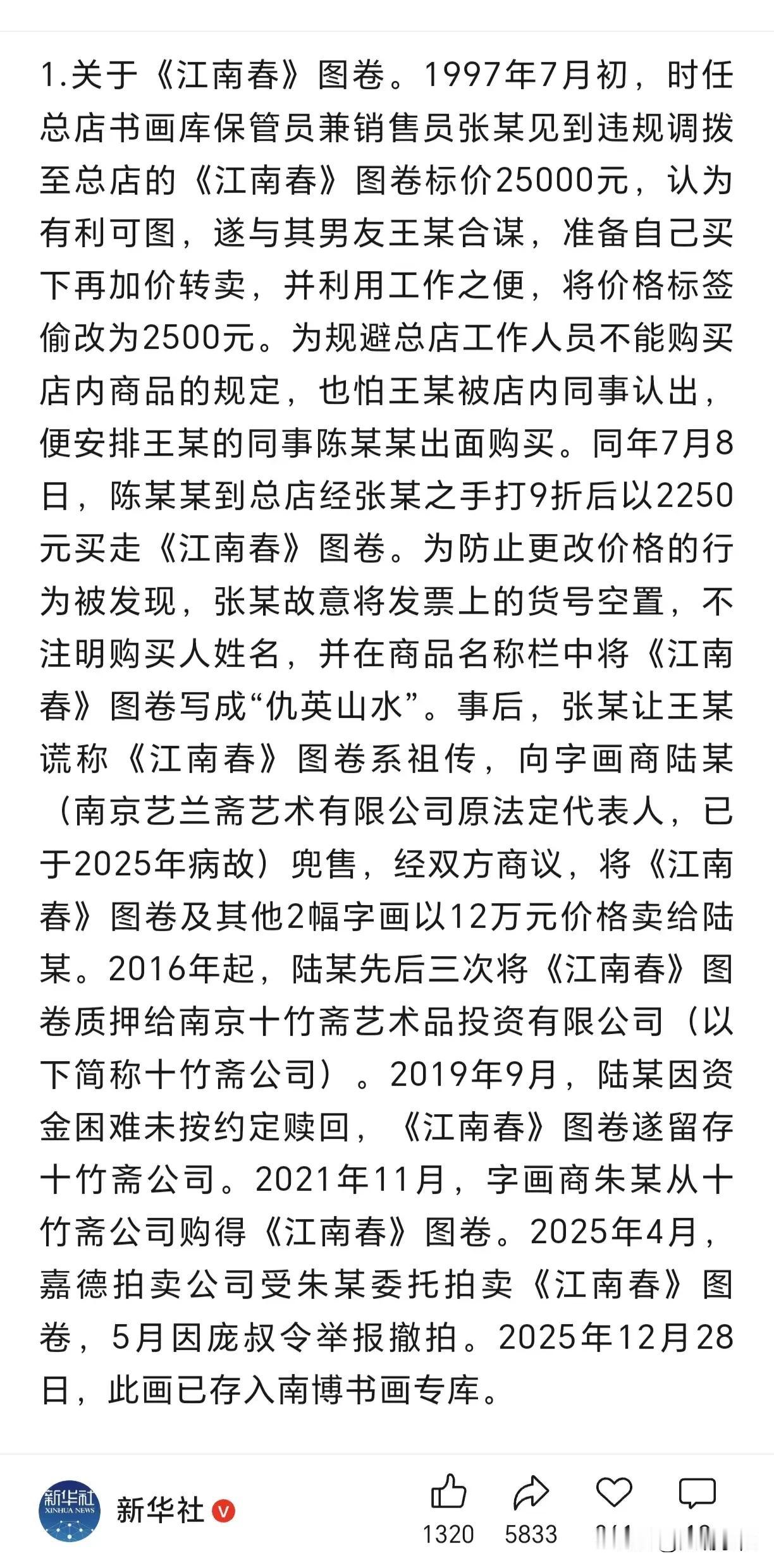 “南博名画事件”调查结果出来了,原院长徐湖平已经被留置监察了,三个部门共29人被追究责任,其中多人被追究刑事责任。 不得不说,高级别调查组效率真的很高,从成立调查组到出调查结果不到两个月,而且涉案的每一幅名画来龙去脉都查的明明白白。 太阳底下没有新鲜事,记得一年前看过一篇古玩类的网文,里面发生的故事,和南博这件事几乎如出一辙,现在回头看作者可能就是圈内人。
