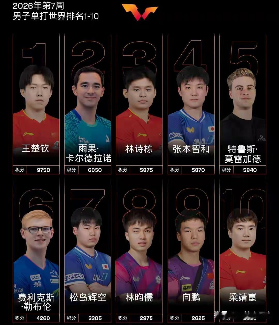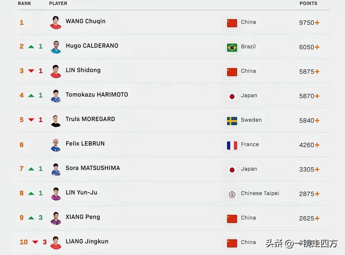 林诗栋在刚刚结束的亚洲杯赛止步八强,世界排名积分被在美洲杯成功卫冕的巴西名将雨果超越,排名降至第三,亚洲杯夺冠的王楚钦仍然位居第一,获得亚军的张本智和仍然排名第四,梁靖崑也下降三位来到第十,向鹏上升三位反超梁靖崑来到第九。