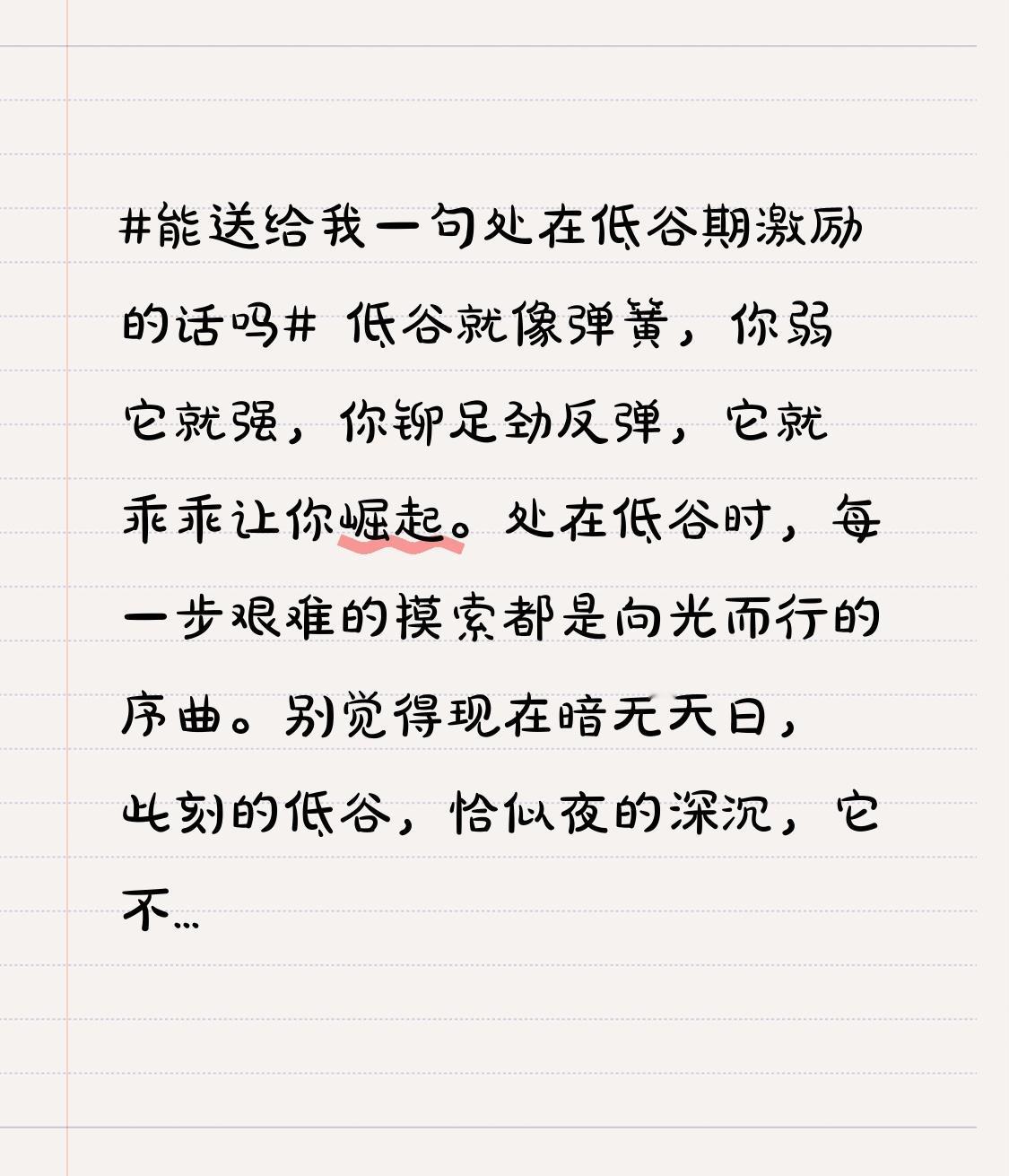低谷就像弹簧,你弱它就强,你铆足劲反弹,它就乖乖让你崛起。处在低谷时,每一步艰难的摸索都是向光而行的序曲。别觉得现在暗无天日,此刻的低谷,恰似夜的深沉,它不是结束,而是星辰即将点亮的前奏。低谷不是用来停留的,咬咬牙站起来,干就完了!把这当作磨砺自己的过程,就像磨刀石,现在的磨砺,是为了未来成就一把削铁如泥的利刃。坚持走下去,风暴过后,必是万里晴空,黎明自会到来!